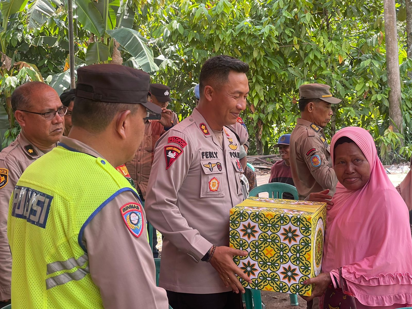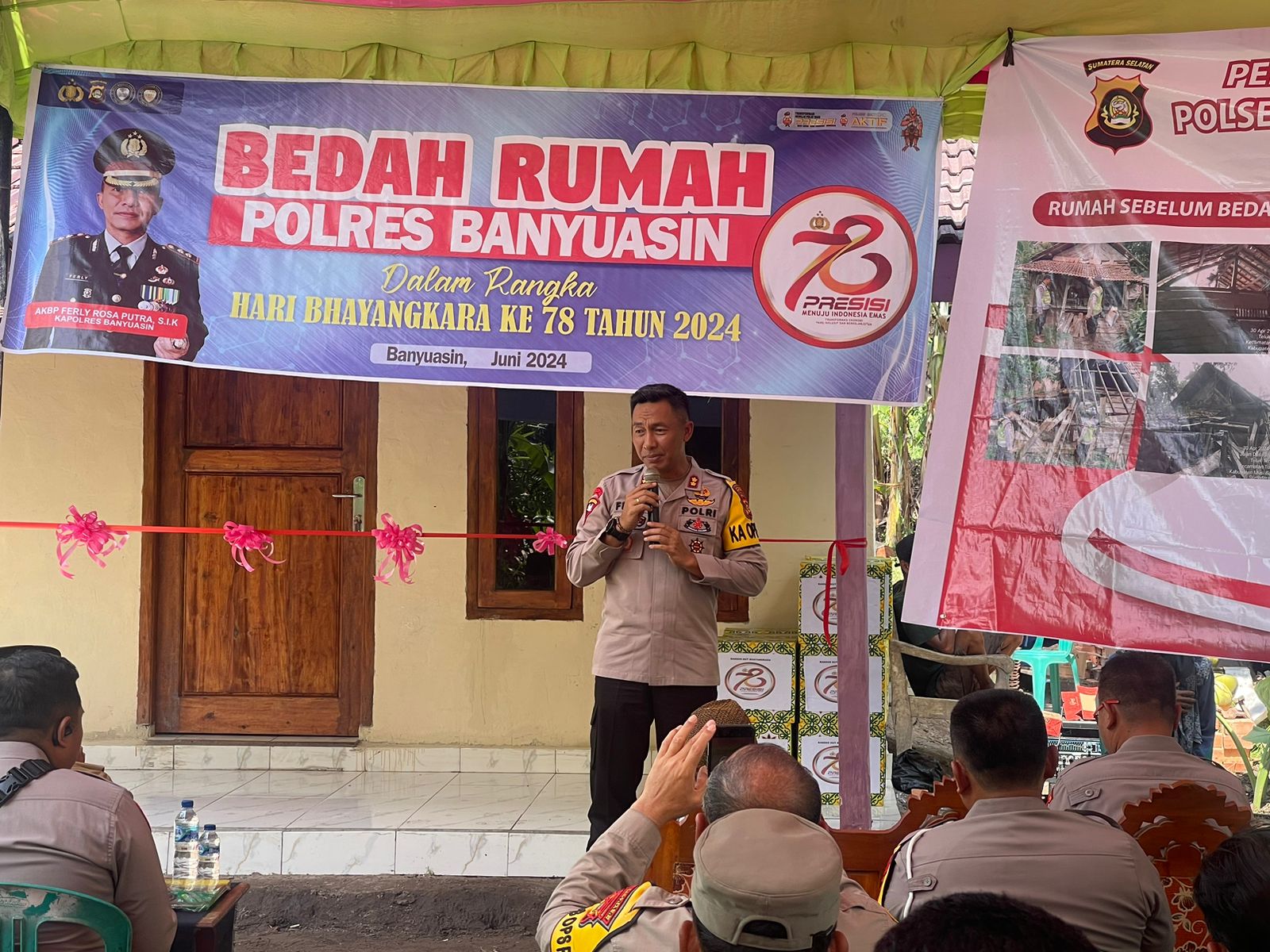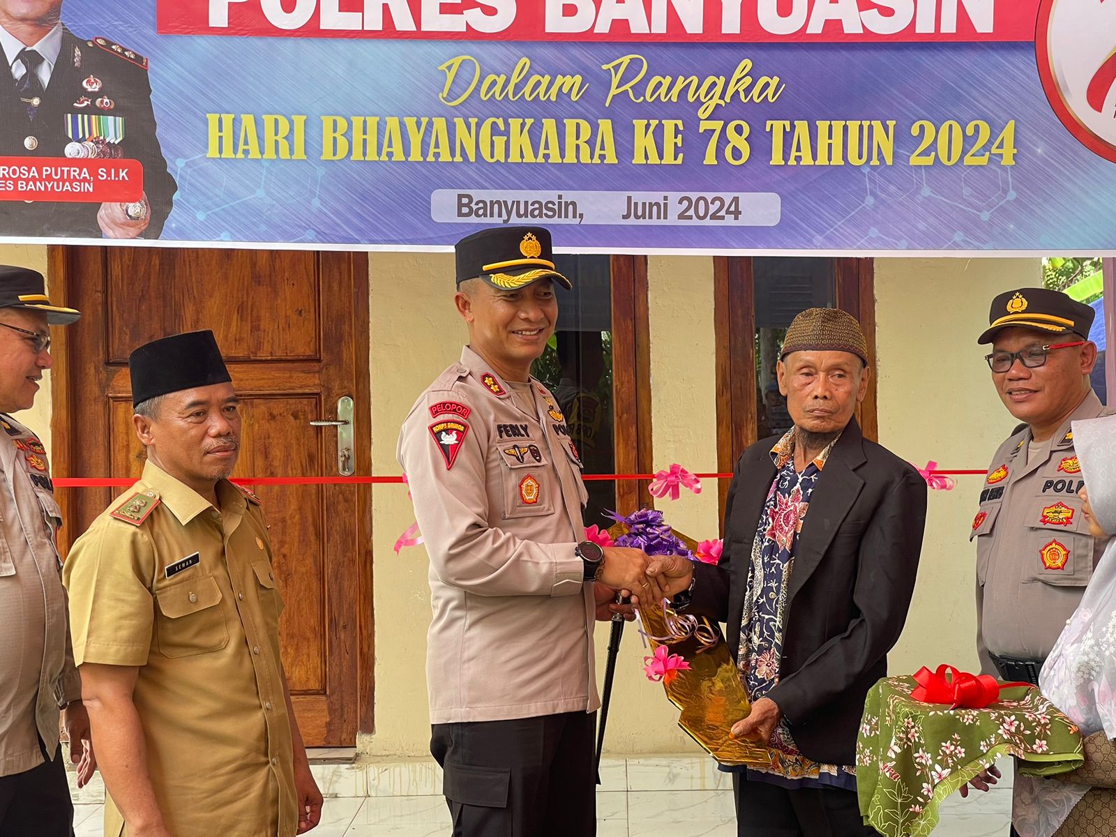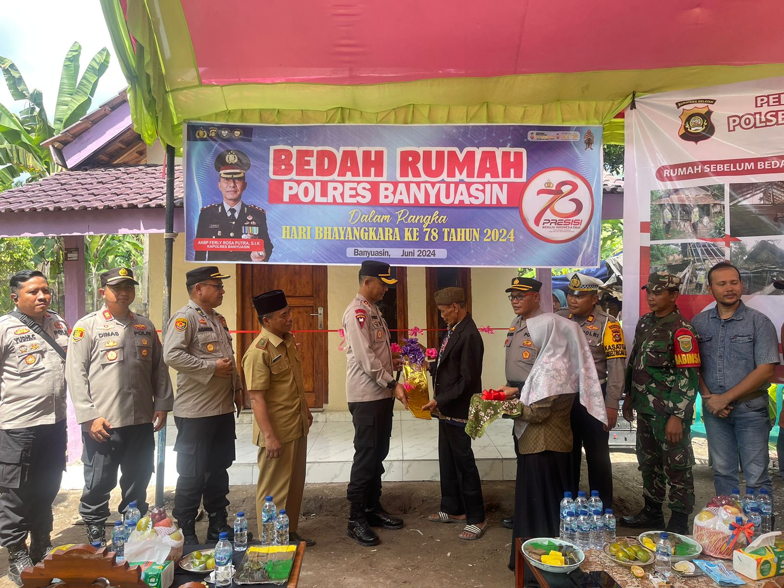 BANYUASIN — Kapolres Banyuasin AKBP Ferly Rosa Putra SIK* meresmikan bedah rumah dan sekaligus menggelar bakti sosial (Baksos) di Dusun VI Desa Bentayan Kecamatan Tungkal Ilir Kabupaten Banyuasin. Kegiatan bedah rumah dan baksos tersebut dalam rangka HUT Bhayangkara Ke-78.