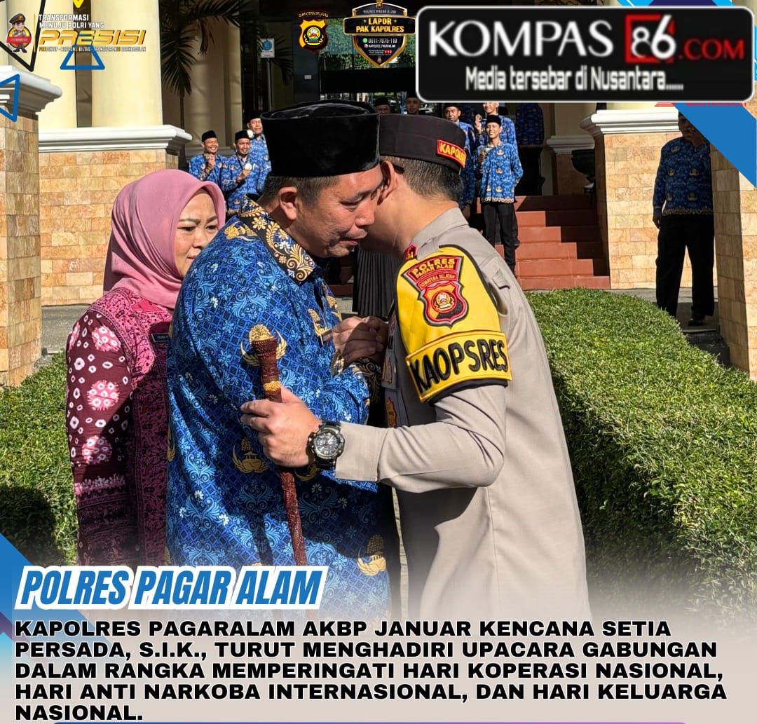 Kapolres Pagaralam AKBP Januar Kencana Setia Persada, S.I.K., turut menghadiri upacara gabungan dalam rangka memperingati Hari Koperasi Nasional, Hari Anti Narkoba Internasional, dan Hari Keluarga Nasional. Kegiatan ini dilaksanakan dengan khidmat dan dipimpin langsung oleh Walikota Pagaralam, Ludi Olyansyah.