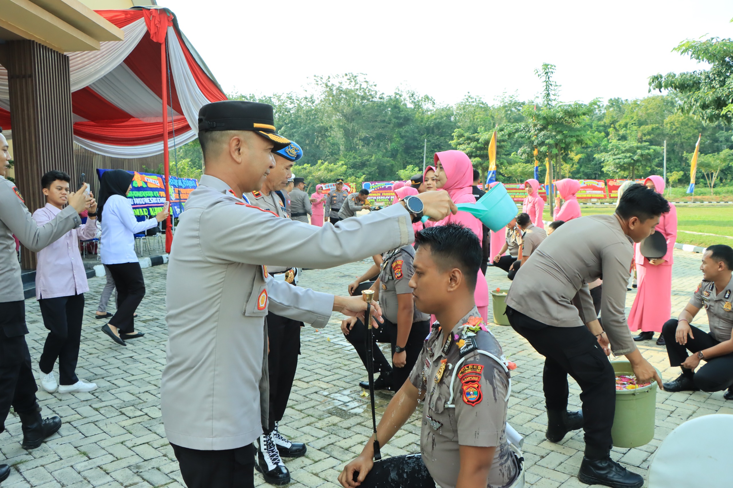 Adapun setelah upacara tersebut, dilanjutkan dengan syukuran kenaikan pangkat dan kemudian puluhan personel yang naik pangkat menjalani tradisi penyiraman air kembang oleh Kapolres didampingi PJ ketua Bhayangkari Cabang Tubaba.