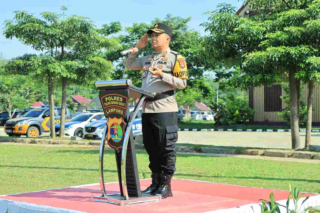 Tulang Bawang Barat,Kompas86.Com Kapolres Tulang Bawang Barat, Polda Lampung AKBP Sendi Antoni. S. I.K., M.I.K., memimpin langsung apel gelar pasukan dalam rangka Operasi Zebra Krakatau 2024, bertempat di Halaman Lapangan Apel Mapolres Tubaba, Senin (14/10/24) Pagi, menandai dimulainya operasi yang akan digelar selama dua pekan, dari tanggal 14 hingga 27 Oktober 2024.