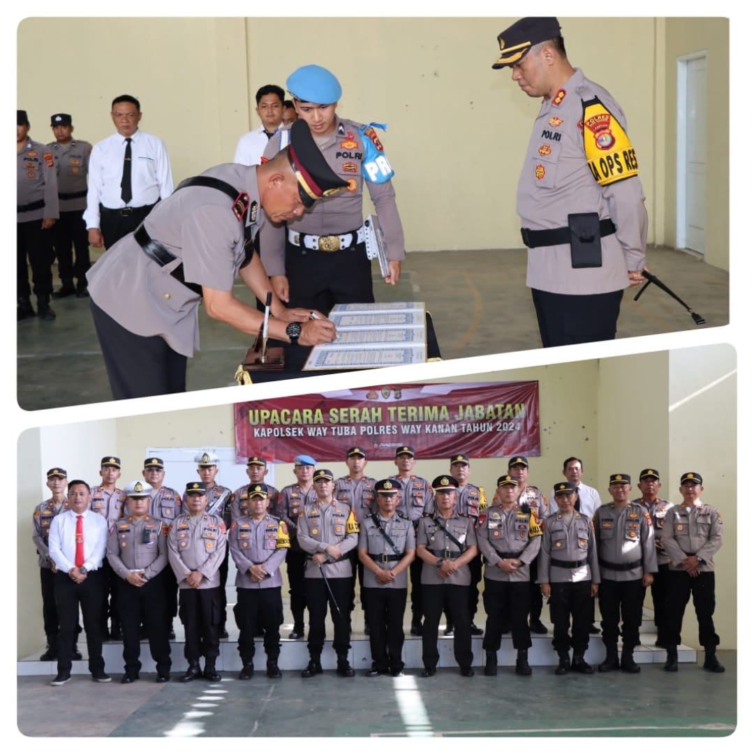 Polres Way Kanan gelar serah terima jabatan (sertijab) Kapolsek Way Tuba dari AKP Ahmad Kartubi, S.H diserahterimakan kepada IPTU Boby bertempat di GSG Pesat Gatra Polres Way Kanan. Sabtu (19/10/2024).