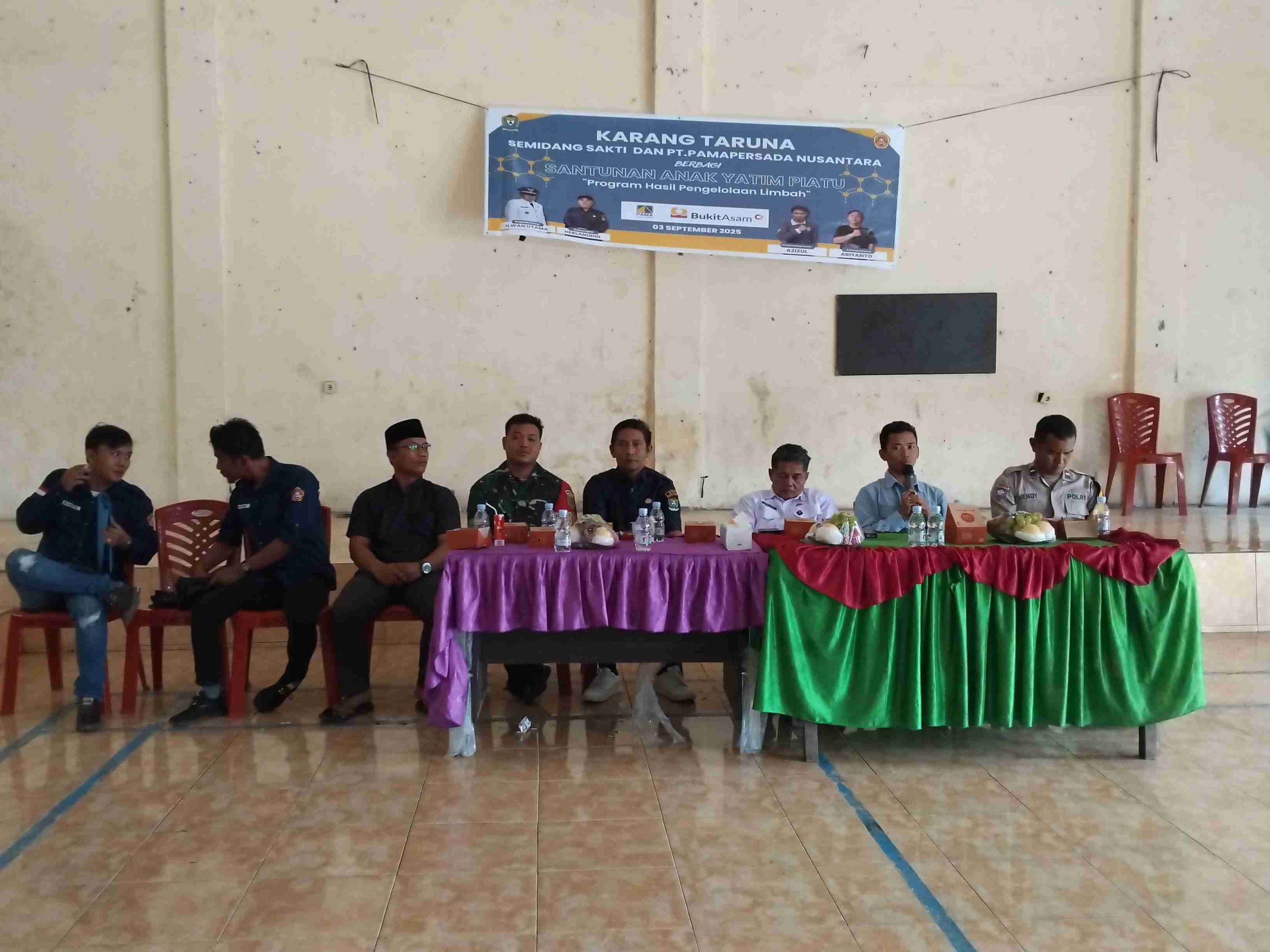 Ketua Karang Taruna”Semidang Sakti” Azizul, dalam sambutannya menegaskan bahwa kegiatan ini bertujuan membantu anak-anak Yatim Piatu dalam memenuhi kebutuhan terutama untuk kepentingan sekolah, dan sumber dana kegiatan santunan ini berasal dari hasil pengelolaan limbah dari perusahaan.
