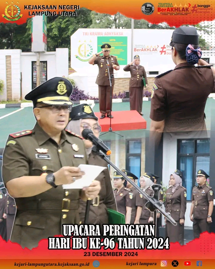 Lampung Utara,Kompas86.Com Kepala Kejaksaan Negeri Lampung Utara, Hendra Syarbaini, S.H., M.H., memimpin Upacara Peringatan Hari Ibu ke-96 Tahun 2024 dengan tema “Perempuan Menyapa, Perempuan Berdaya Menuju Indonesia Emas 2045”, pada Senin, 23 Desember 2024. Upacara ini diikuti oleh Kasubbagbin, Para Kasi, Jaksa, serta seluruh Pegawai dan Honorer Kejaksaan Negeri Lampung Utara.