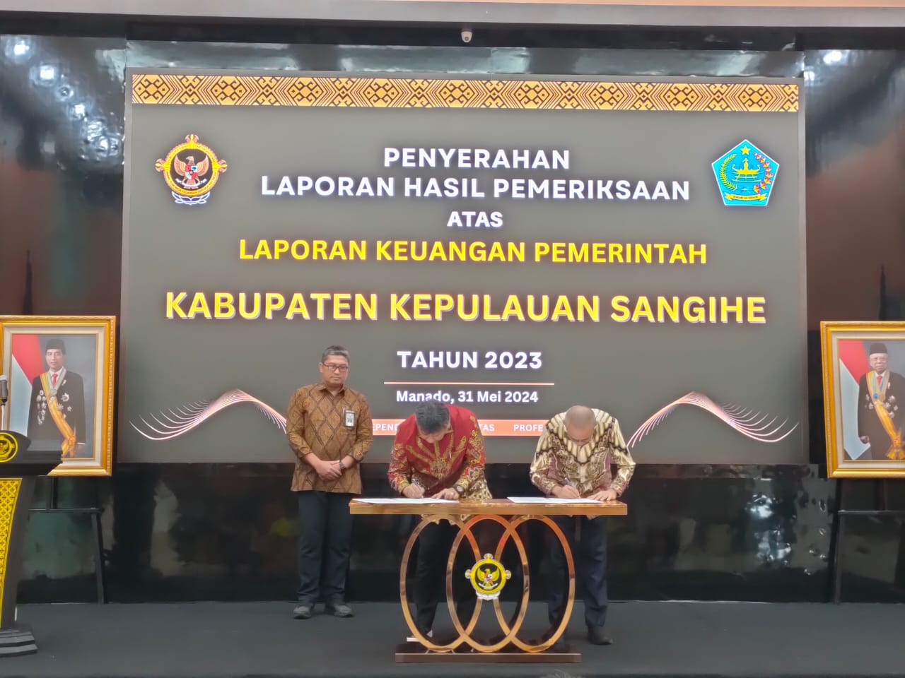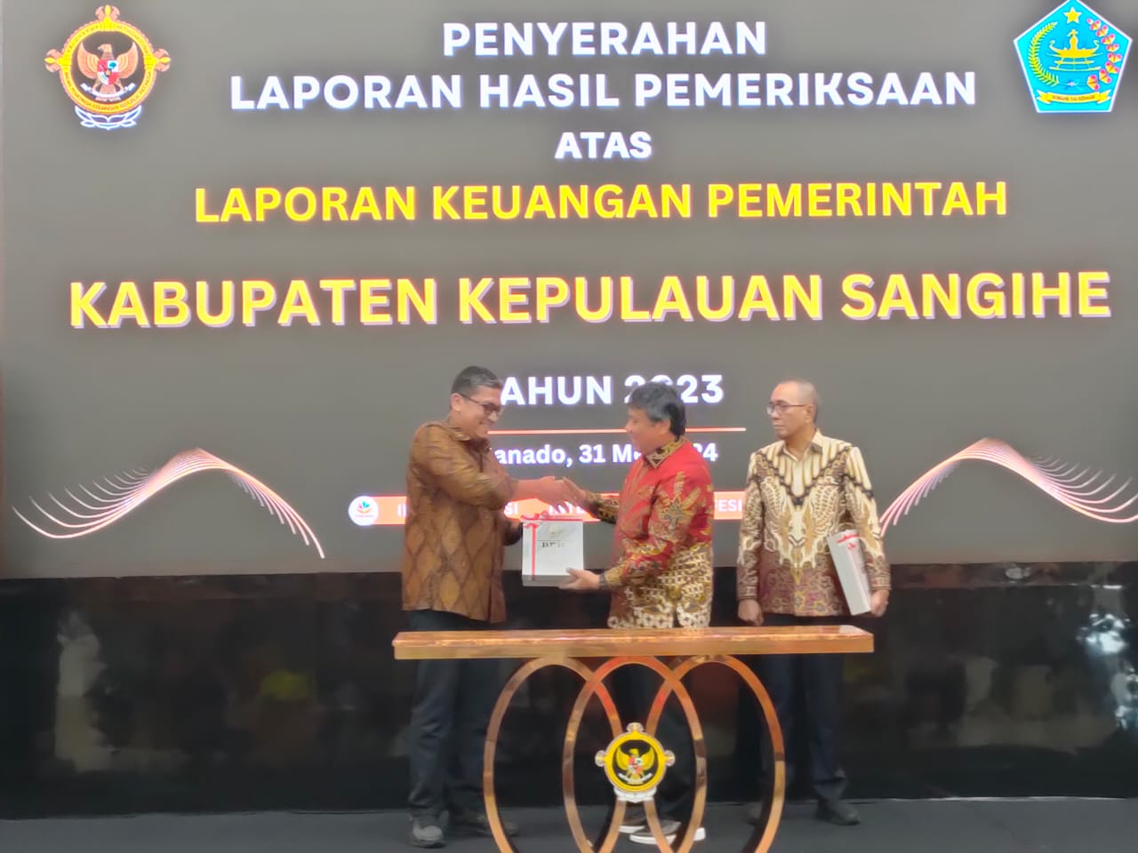 Bertempat di kantor Badan Pemeriksaan Keuangan (BPK) perwakilan provinsi Sulawesi Utara pada hari Jumat (31/05/24) PJ Bupati kabupaten kepulauan Sangihe Albert Huppy Wounde,SH,MH menerima laporan hasil pemeriksaan BPK dengan Opini Wajar Tanpa Pengecualian (WTP).