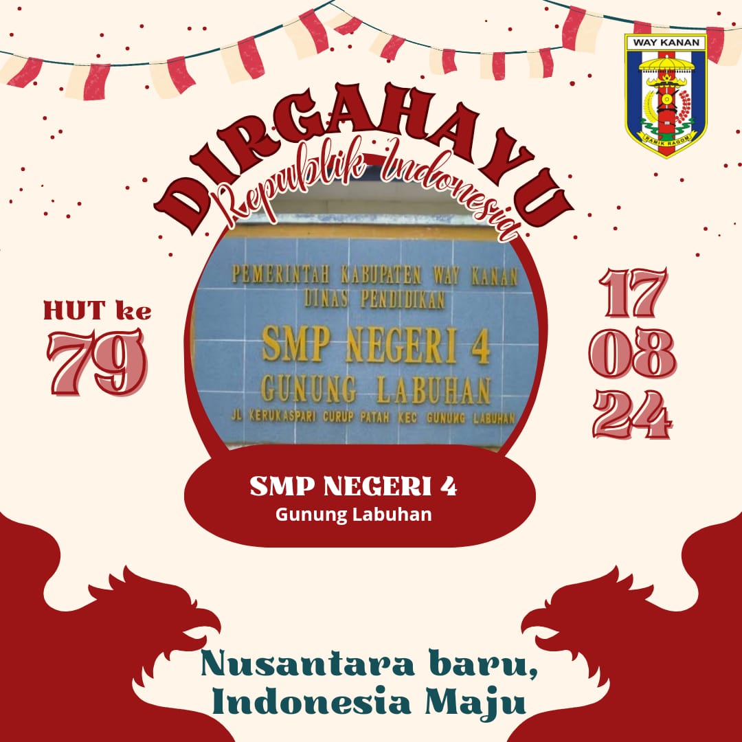 Serasa tak mau ketinggalan dalam momen besar dan bersejarah ini,Instansi Pendidikan yang ada di Kabupaten Waykanan pun berjibaku ikut memeriahkan kemerdekaan Republik Indonesia yang ke 79,salah Satu nya UPT SMPN 04 Gunung Labuhan yang ada di Kecamatan Gunung Labuhan Kabupaten Waykanan.Bersama Hj.Waspi,S.Pd selaku Kepala Sekolah nya,SMPN 04 Gunung Labuhan pun sedang di sibukkan untuk mempersiapkan diri dalam penyambutan nya,seperti berbagai kegiatan yang akan di meriahkan oleh murid-muridnya.