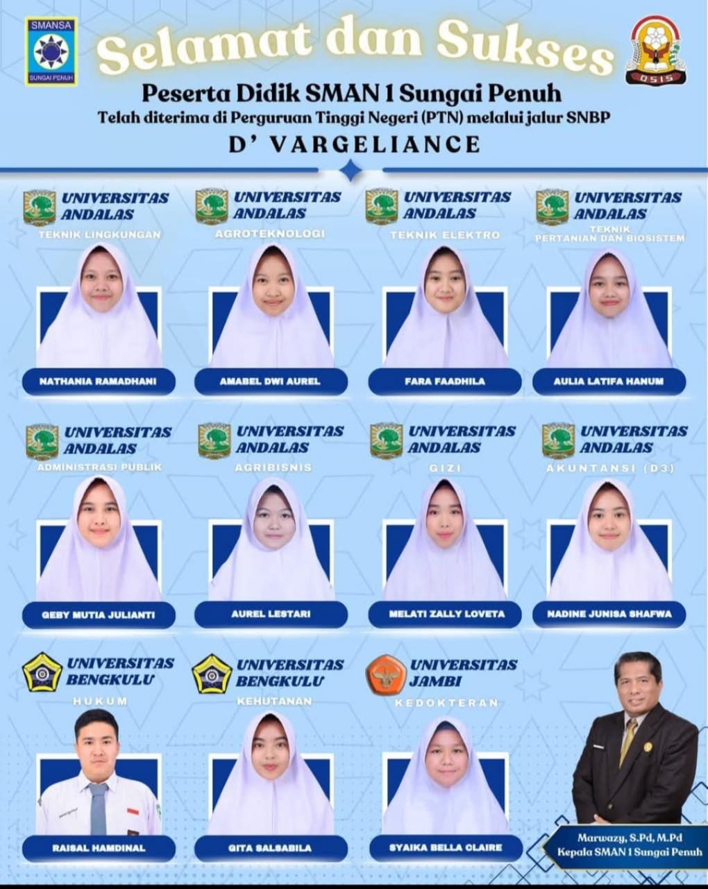 Termasuk di SMA Negeri 1 Sungai Penuh, dimana pada Tahun ini sebanyak 53 Orang siswa/i dinyatkan lulus di berbagai Perguruan Tinggi ternama di Indonesia, seperti UGM, ITB, IPB, Undip, Unand, Unja dan sebagainya. Kepala SMA Negeri 1 Sungai Penuh, Bapak MARWAZY, M.Pd. ketika kami temui, Beliau merasa senang dan bangga.