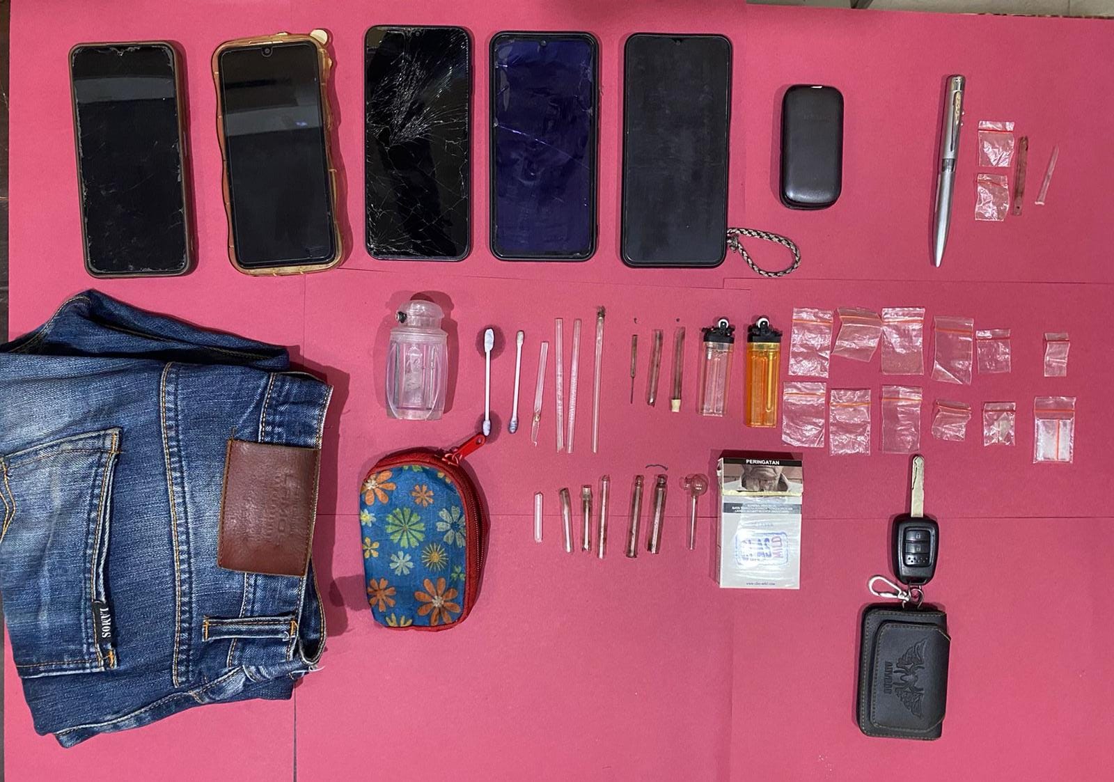 Polisi langsung menggerebek dan menemukan ketiga sedang akan mengisap sabu. Dari penggeledahan ditemukan sejumlah barang bukti berupa 1(satu) pelastik klip yang berisikan shabu seberat 0,65 gram, (satu) buah dompet kecil warna biru merah bermotif bunga;