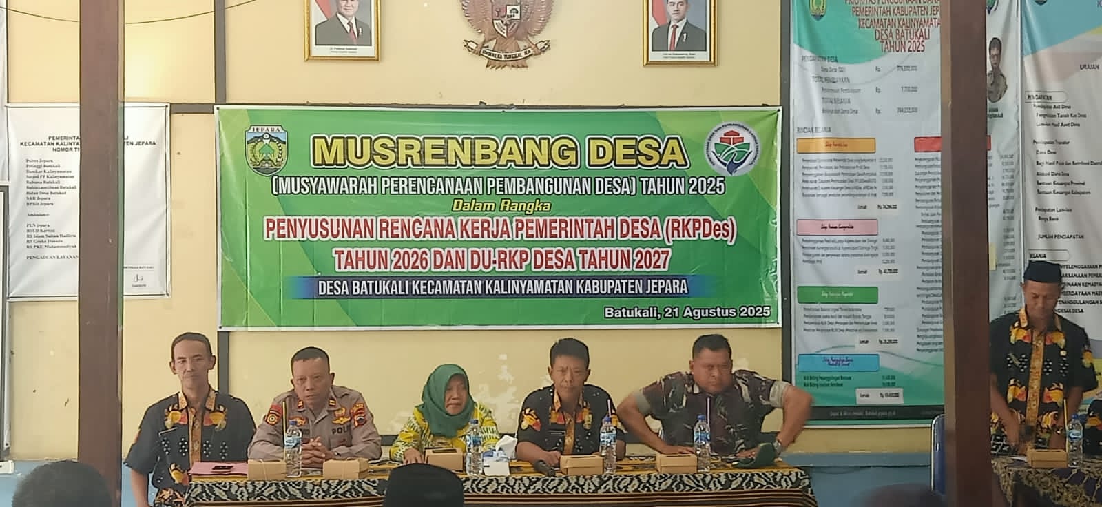 Jepara – Dalam rangka menyusun arah pembangunan desa yang berkelanjutan, Pemerintah Desa Batukali, Kecamatan Kalinyamatan, Kabupaten Jepara, menggelar Musyawarah Perencanaan Pembangunan Desa (Musrenbangdes) untuk penyusunan Rencana Kerja Pemerintah Desa (RKPDes) tahun 2026 serta Daftar Usulan Rencana Kerja Pemerintah (DU-RKP) tahun 2027, bertempat di Balai Desa Batukali, Kamis (21/8).