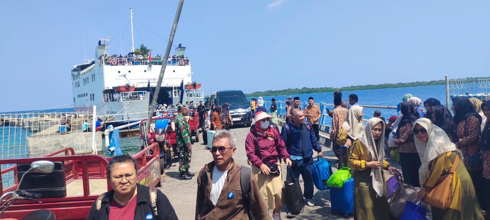 Jepara 4-7-2025– Dalam rangka memastikan kelancaran dan keamanan aktivitas transportasi laut, Serka Heru Lukman selaku Bati Wanwil Koramil 10/Karimunjawa beserta anggota, bersama unsur gabungan dari Pos TNI AL, Polsek Karimunjawa, Polairud, Balai Kesehatan Pelabuhan (Karkes), dan Syahbandar Karimunjawa melaksanakan patroli dan pemantauan kedatangan kapal penumpang KMP. Siginjai di Pelabuhan ASDP Karimunjawa, Kecamatan Karimunjawa, Kabupaten Jepara, pada hari Jumat, [4/7].