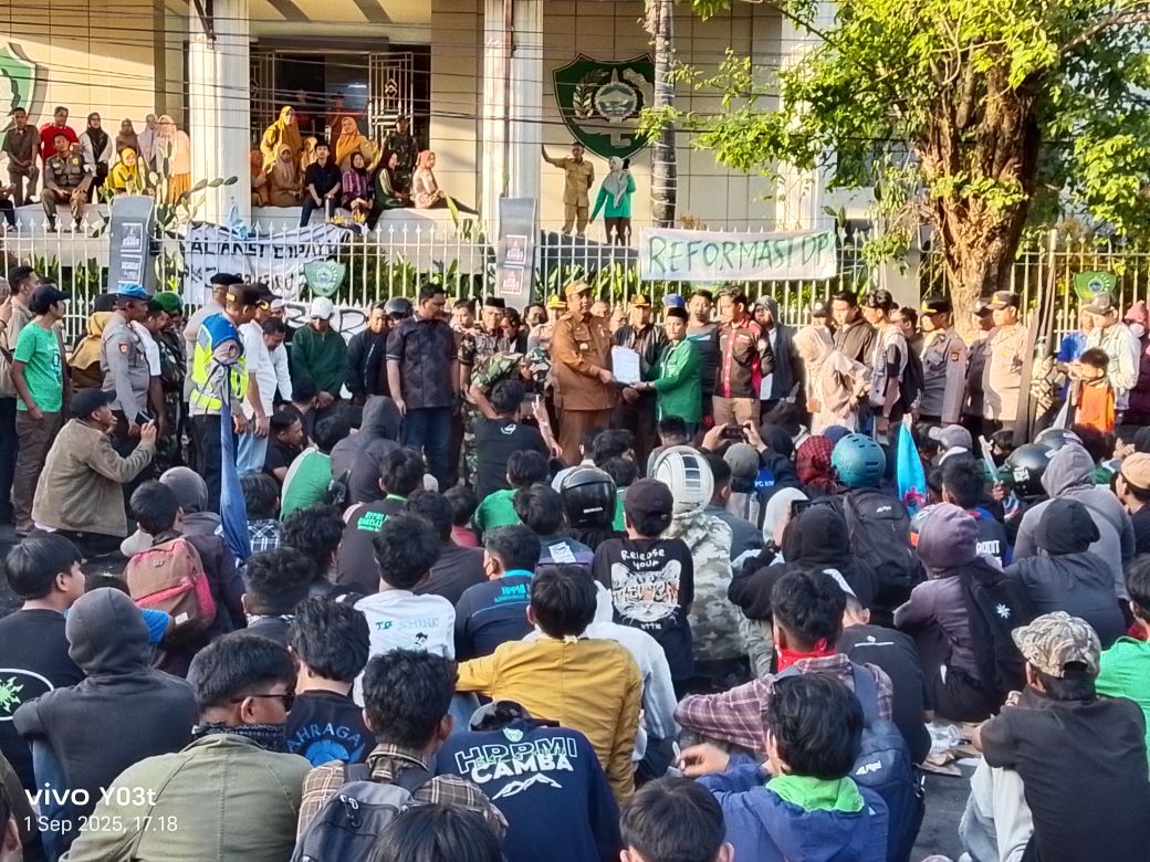 Kompas86.Com- Ketika di berbagai daerah aksi demonstrasi kerap menimbulkan keprihatinan karena berakhir ricuh dan tidak kondusif, Kabupaten Maros justru mencatat sejarah baru dengan menghadirkan wajah demokrasi yang damai dan penuh makna. Gabungan dari aliansi HPPMI, KSPSI, PMBI/KSN. Aksi berlangsung di depan Gedung DPRD Kabupaten Maros, Kecamatan Turikale, Kabupaten Maros, Sulawesi Selatan. Senin, 01/09/2025.