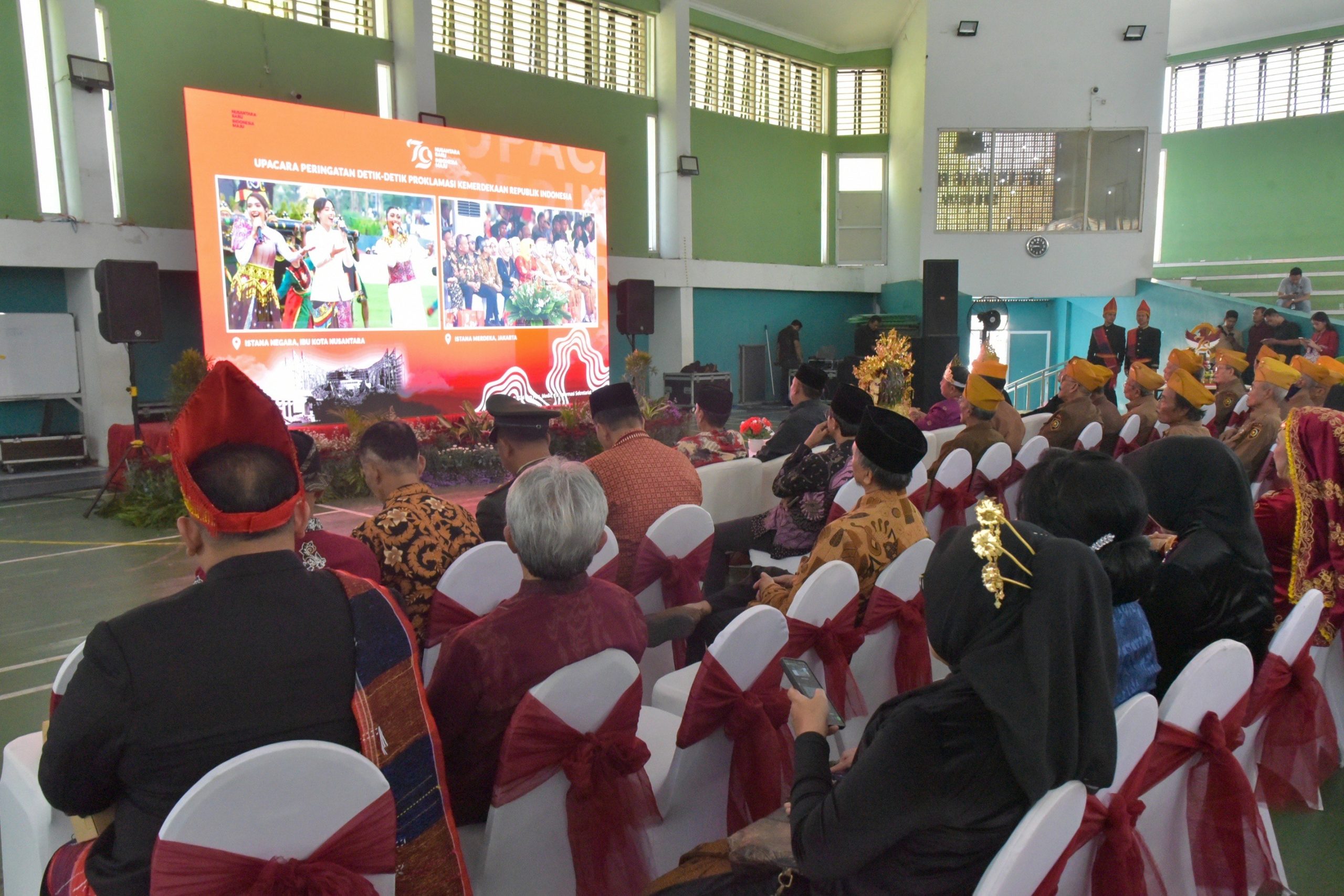 Surabaya |Jatim | Wali Kota Surabaya Eri Cahyadi bersama para veteran menyaksikan Upacara Detik-Detik Proklamasi Kemerdekaan Republik Indonesia (RI). Prosesi upacara peringatan HUT ke-79 RI itu disiarkan secara langsung dari Istana Negara, Ibu Kota Nusantara (IKN), Sabtu (17/8/2024).