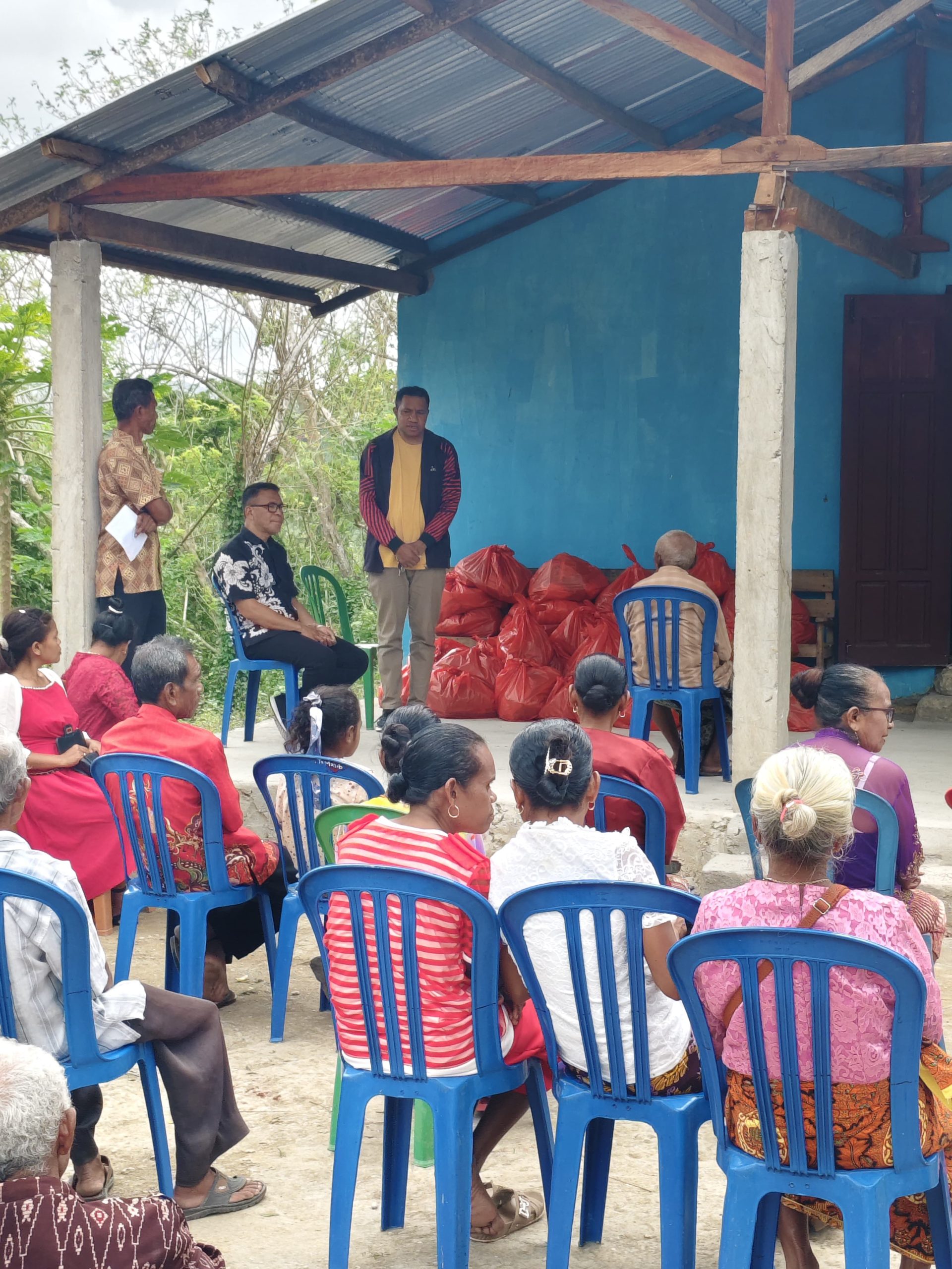Dalam kegiatan ini, Pastor Johannes didampingi para guru dan utusan murid membagikan bantuan kepada umat Kapela St. Antonius Claret Beskelo.