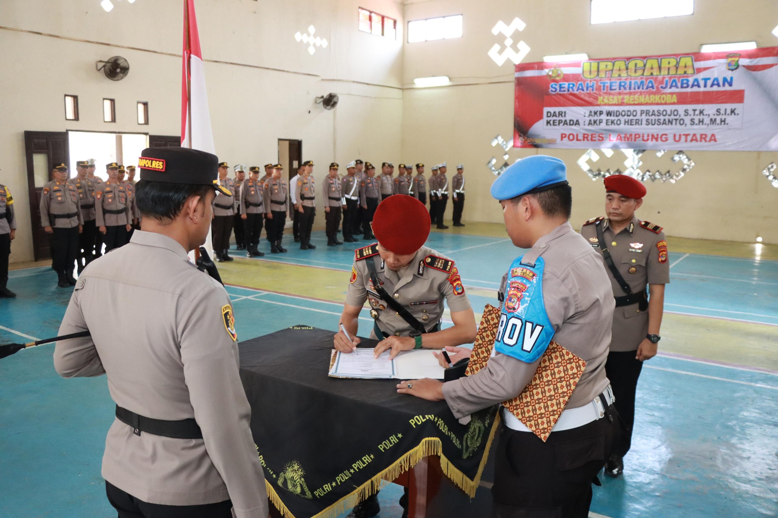 Pergantian tersebut secara resmi dilakukan upacara serah terima jabatan yang di pimpin oleh Kapolres Lampung Utara AKBP Teddy Rachesna, S.H., S.I.K., M.Si. dengan di hadiri PJU, personel dan Bhayangkari Polres Lampung Utara.