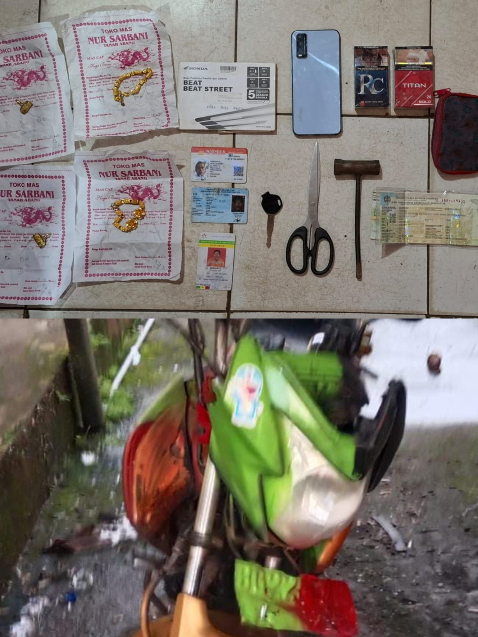 Dari tangan pelaku, polisi mengamankan barang bukti berupa sepeda motor Honda Tiger BG-2254-OM yang digunakan saat beraksi, logam mulia milik korban, handphone Oppo biru, dan sebuah kunci leter T yang digunakan untuk membobol kendaraan.