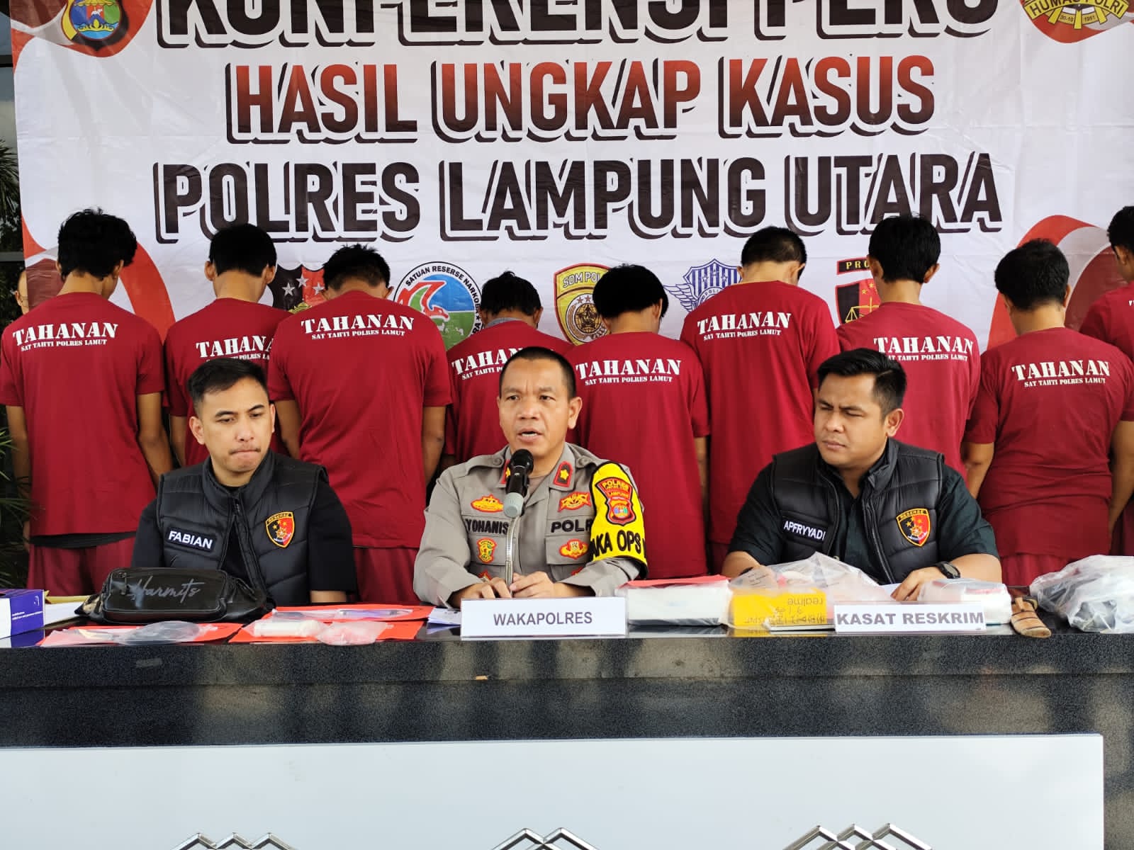 “Dalam rangka menciptakan situasi kamtibmas yang aman dan kondusif di wilayah Kabupaten Lampung Utara periode Maret 2025 berhasil ungkap pencurian dengan kekerasan dan atau penadahan 2 kasus, curat 5 kasus dan Narkoba 1 kasus dengan mengamankan 10 orang pelaku,” kata Waka Polres Lampung Utara Kompol Yohanes mewakili Kapolres Lampung Utara AKBP Deddy Kurniawan saat menggelar Konferensi Pers, Jumat (14/3/25).
