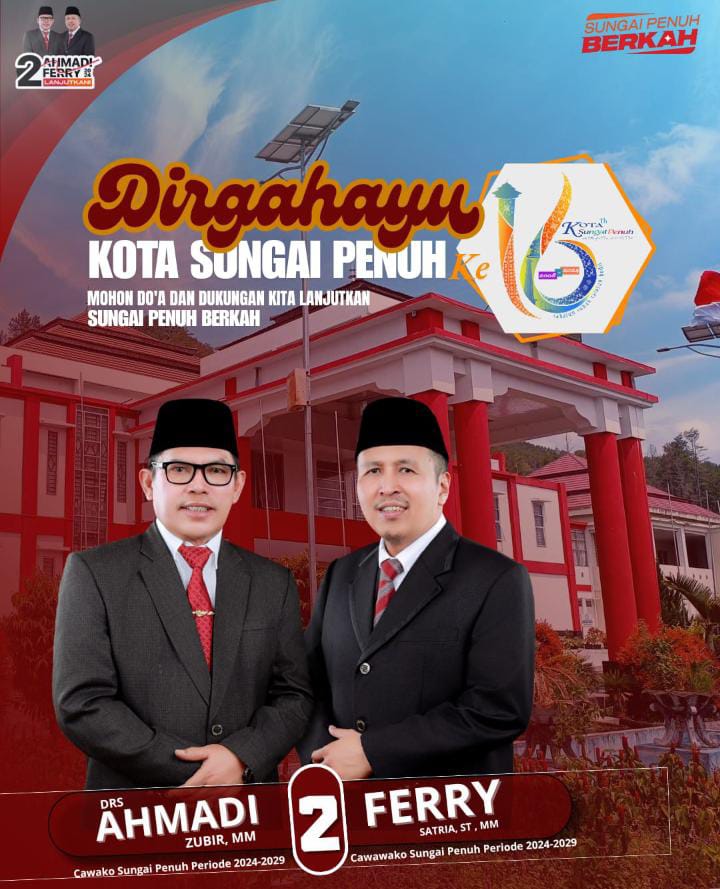 KoSUNGAI PENUH, Kompas86.com – Pasangan calon (Paslon) Wali Kota dan Wakil Wali Kota Sungai Penuh, Ahmadi Zubir (Az) dan Fery Satria (Fer), mengucapkan selamat ulang tahun yang ke-16 Kota Sungai Penuh. Ulang tahun kali ini, yang jatuh pada tanggal 8 November, menjadi momen penting bagi masyarakat kota yang terletak di Provinsi Jambi ini.