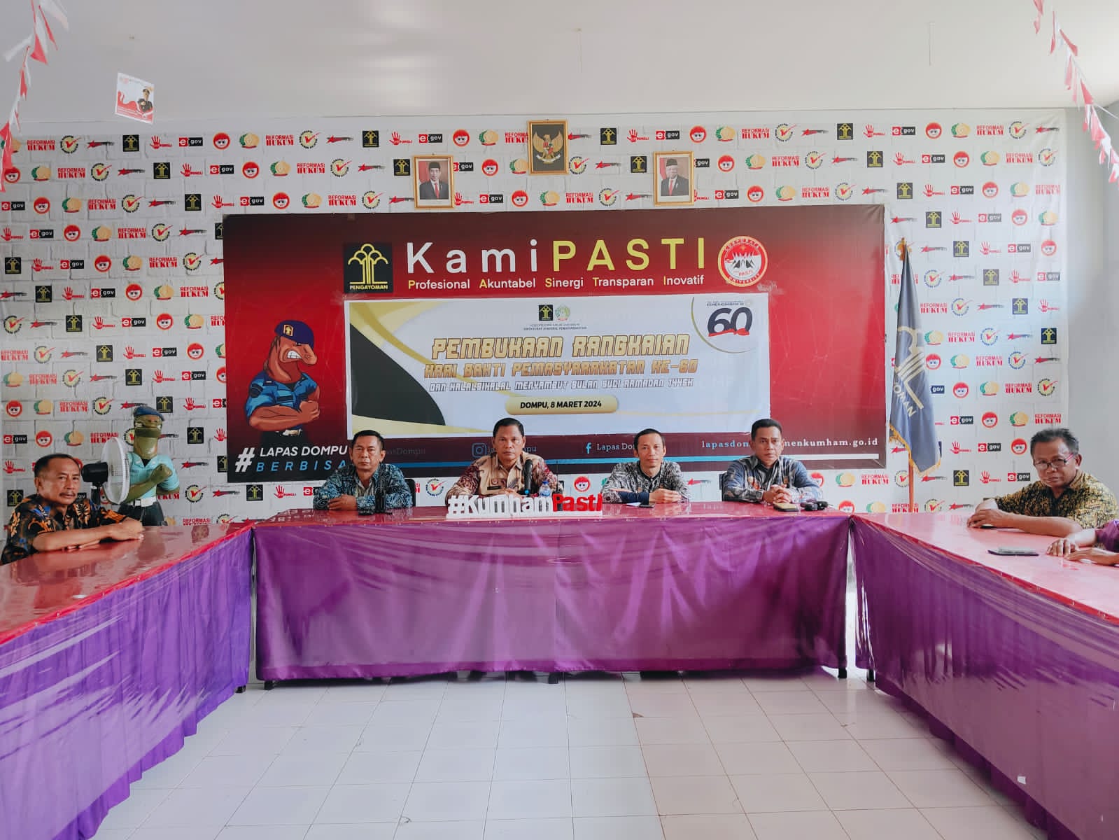Kompas86.com.Dompu.NTB.Kepala Lembaga Pemasyarakatan Kelas IIB Dompu, A. Halik bersama Pejabat struktural dan seluruh jajarannya mengikuti kegiatan Pembukaan Rangkaian Kegiatan Hari Bhakti Pemasyarakatan (HBP) ke-60 dan Halal Bihalal menyambut Bulan Suci Ramadhan 1445 H/2024 M, jum,at (8/3/24) sekira pukul 08.30 Wita, sampai selesai.