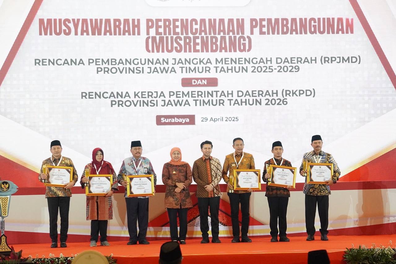 Sidoarjo |Jatim | Kabupaten Sidoarjo kembali menorehkan prestasi membanggakan dalam bidang pembangunan daerah. Dalam gelaran Musyawarah Perencanaan Pembangunan (Musrenbang) Provinsi Jawa Timur yang berlangsung di Hotel Shangri-La Surabaya pada Selasa (29/4/2025), Bupati Sidoarjo H. Subandi, S.H., M.Kn. menerima langsung piagam penghargaan sebagai Terbaik I Kategori Kabupaten dalam ajang Penghargaan Pembangunan Daerah (PPD) Tahun 2025 dari Gubernur Jawa Timur, Hj. Khofifah Indar Parawansa.