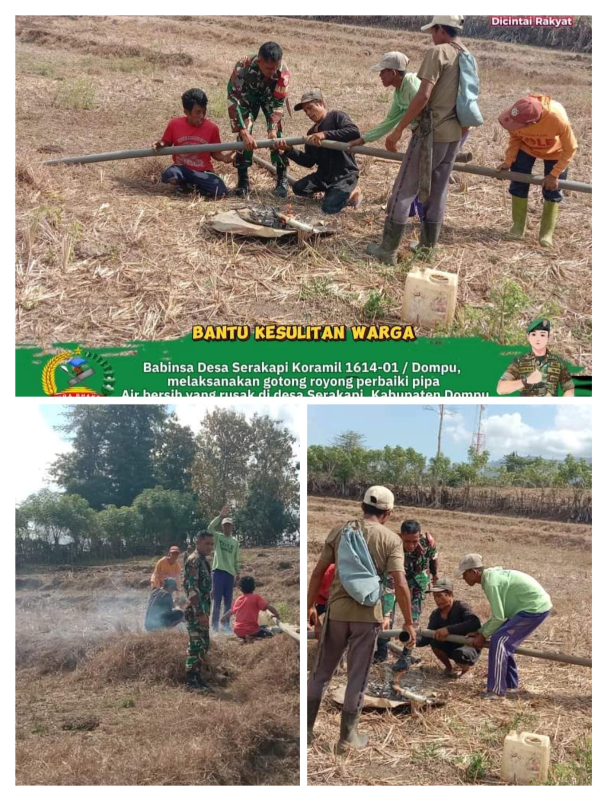 Babinsa Desa Serakapi Koramil 1614-01 / Dompu, melaksanakan gotong royong perbaiki pipa Air bersih yang rusak di desa Serakapi, Kabupaten Dompu, Kamis (04/07/24)