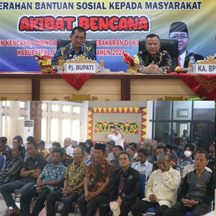 Lampung Utara,Kompas86.Com Pemerintah Kabupaten Lampung Utara kembali menunjukkan kepeduliannya terhadap masyarakat yang terkena musibah. Pj. Bupati Lampung Utara, Drs. H. Aswarodi, M.Si., didampingi oleh Kepala Badan Penanggulangan Bencana Daerah (BPBD) Lampung Utara, Drs. Nozi Efialis EF, M.Si., menyerahkan bantuan sosial kepada masyarakat yang terdampak bencana angin kencang puting beliung dan kebakaran di wilayah Kabupaten Lampung Utara. Acara penyerahan bantuan ini berlangsung di Ruang Tapis Setdakab Lampung Utara pada Jumat, 6 September 2024.
