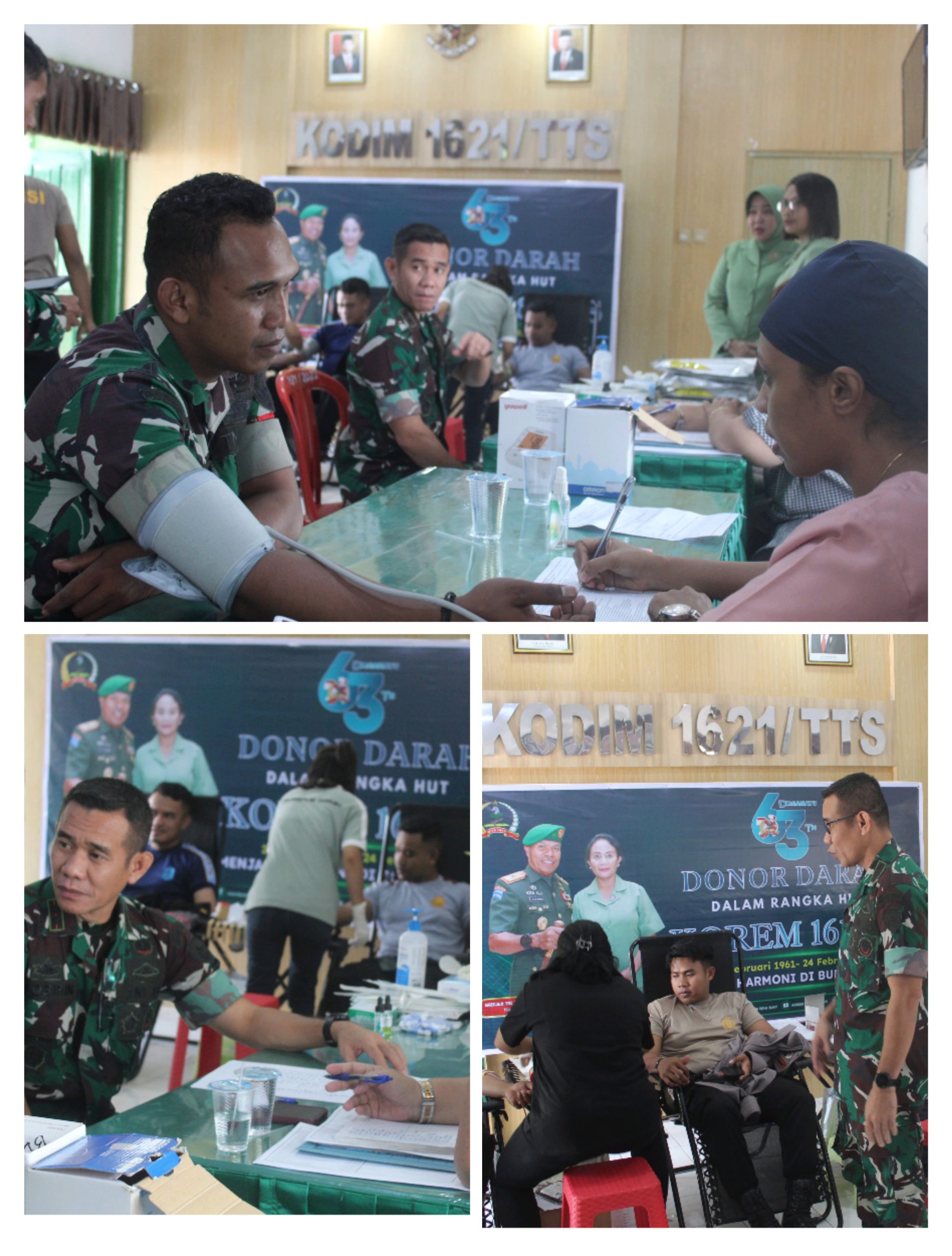 Donor darah yang di gelar di Aula Makodim 1621/TTS ini melibatkan seluruh anggota militer dan PNS Kodim 1621/TTS serta perwakilan Persit KCK Cabang XX Dim 1621/TTS, Perwakilan Anggota Polres TTS, Perwakilan Anggota Rutan Kelas IIB So’E, Iarmi(Ikatan Alumni Resimen Mahasiswa Indonesia) Kodim 1621/TTS.