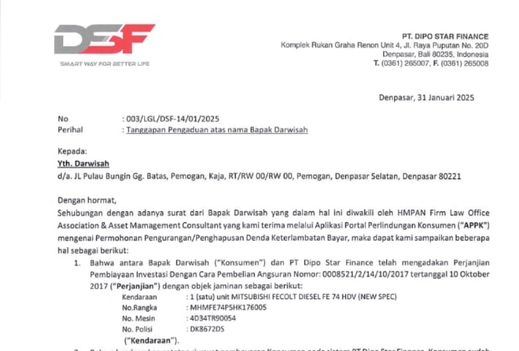 Lebih lanjut, Vera menjelaskan bahwa pihaknya telah memberikan keringanan berupa diskon denda yang awalnya sebesar 20% hingga mencapai 40%. Namun, pelanggan masih mengajukan permohonan tambahan keringanan dengan hanya membayar Rp 70 juta, yang menurut PT DIVO FINANCE 40% itu sudah Final tegasnya,