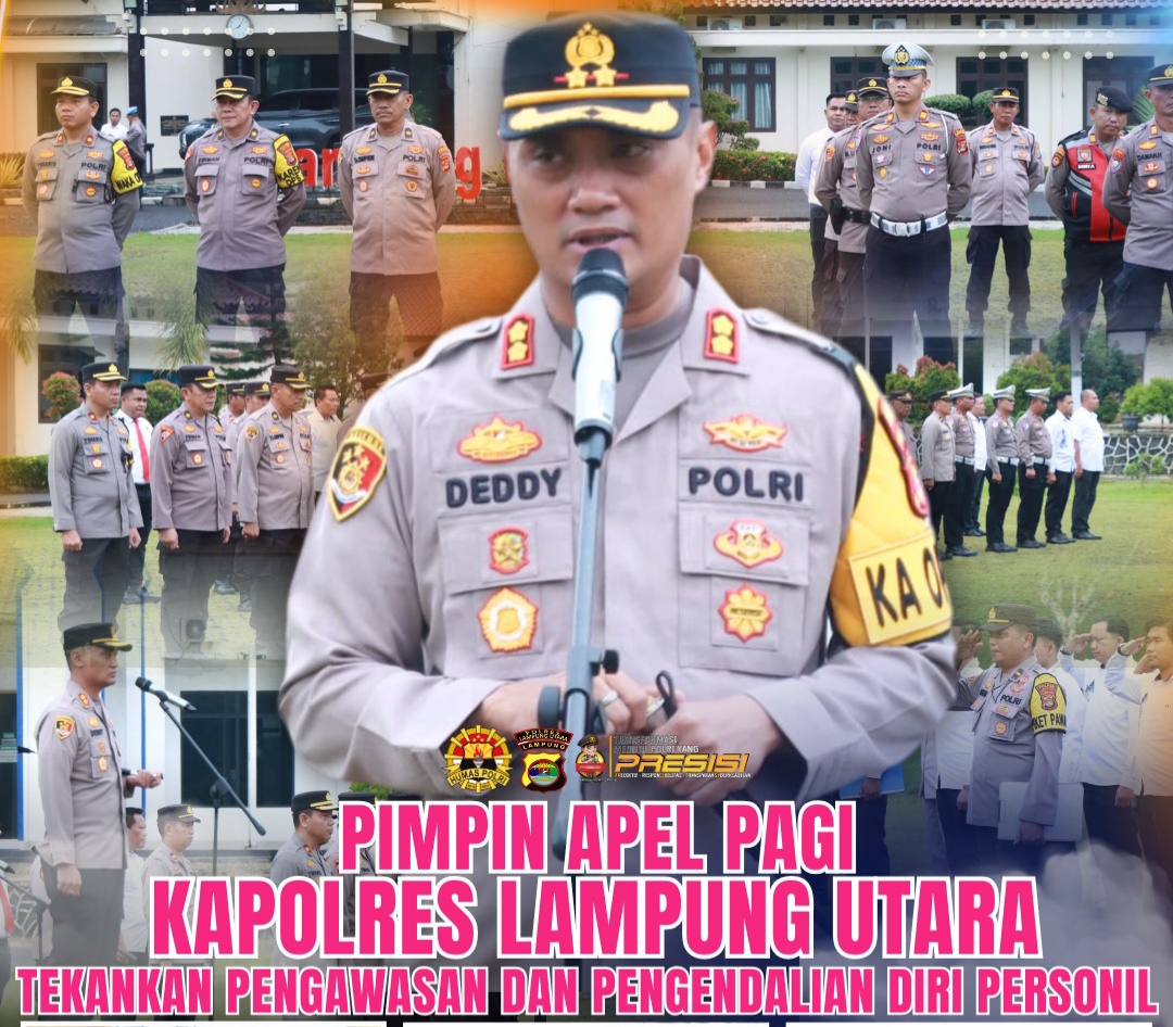 Lampung Utara,Kompas86.Com Kepala Kepolisian Resor (Kapolres) Lampung Utara AKBP Deddy Kurniawan memberikan penekanan kepada seluruh personel untuk meningkatkan pengawasan dan pengendalian diri saat memimpin apel pagi di Mapolres setempat, Senin (24/2/25).