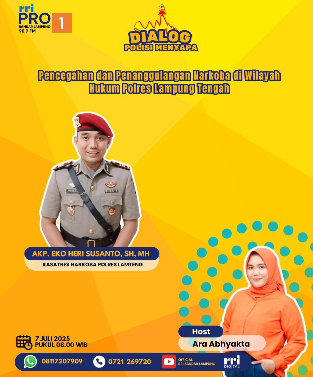 Hal ini disampaikan oleh Kasat Reserse Narkoba Polres Lampung Tengah, AKP Eko Heri Susanto, S.H., M.H, mewakili Kapolres, AKBP Alsyahendra, S.I.K., M.H dalam dialog interaktif bertajuk “Polisi Menyapa” yang disiarkan secara langsung di Pro 1 RRI Bandar Lampung, pada Senin pagi (7/7/25).