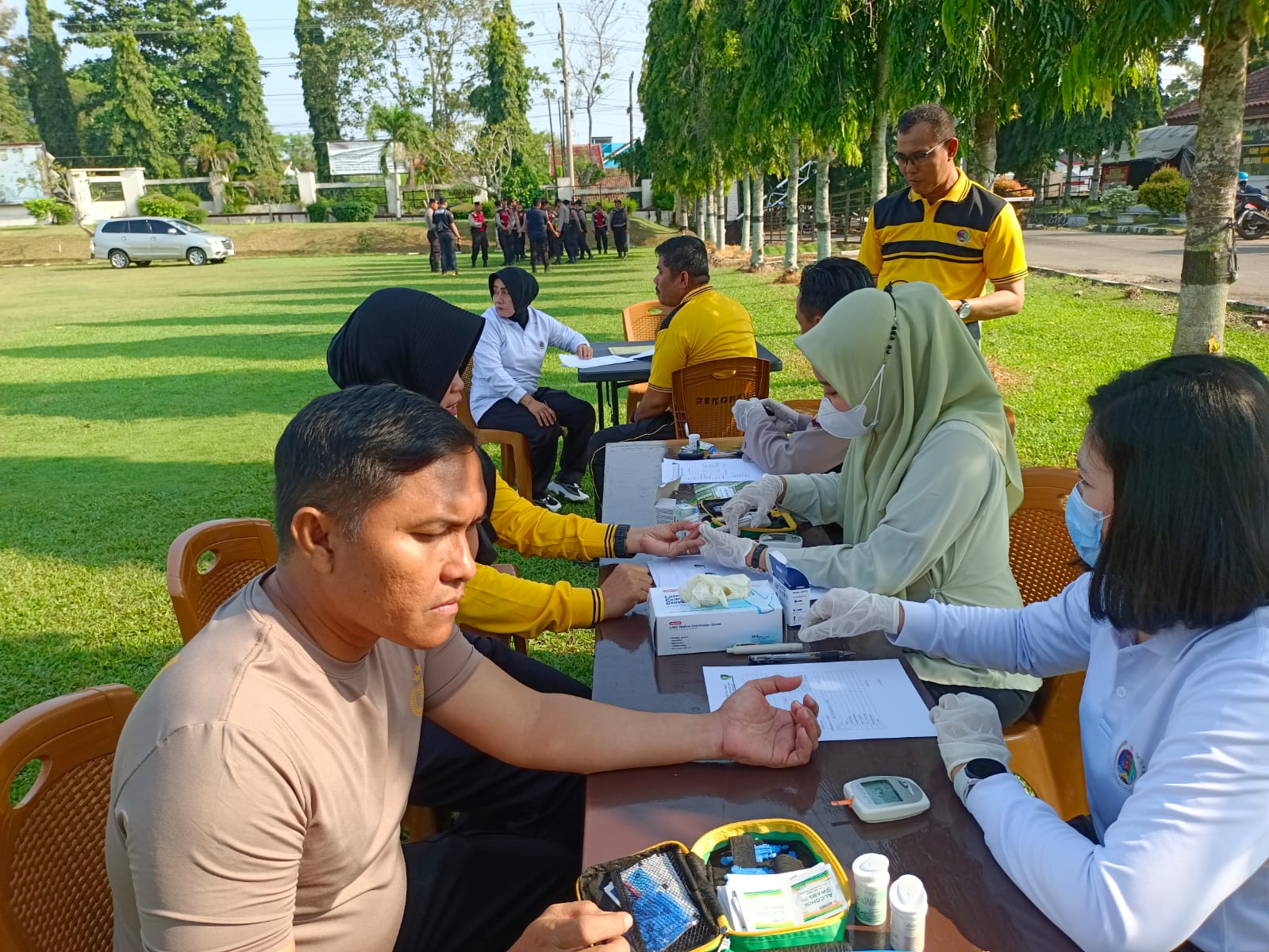 Pemeriksaan kesehatan dilakukan di halaman Mako Polres Lampung Utara mencakup pemeriksaan tensi (tekanan darah), pemeriksaan sampel darah (kolesterol, gula darah, dan asam urat).