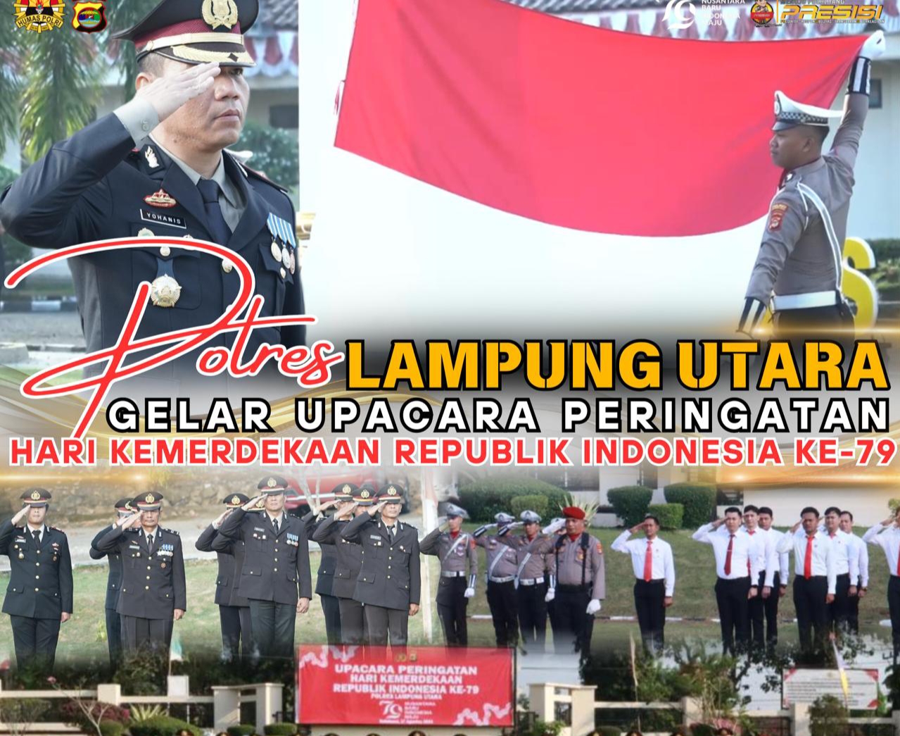 Lampung Utara,Kompas86.Com Polres Lampung Utara, Polda Lampung, menggelar Upacara Peringatan Hari Kemerdekaan Republik Indonesia (RI) Ke-79 Tahun 2024 di lapangan Mapolres setempat, Sabtu (17/08/24), pukul 07.00 WIB.