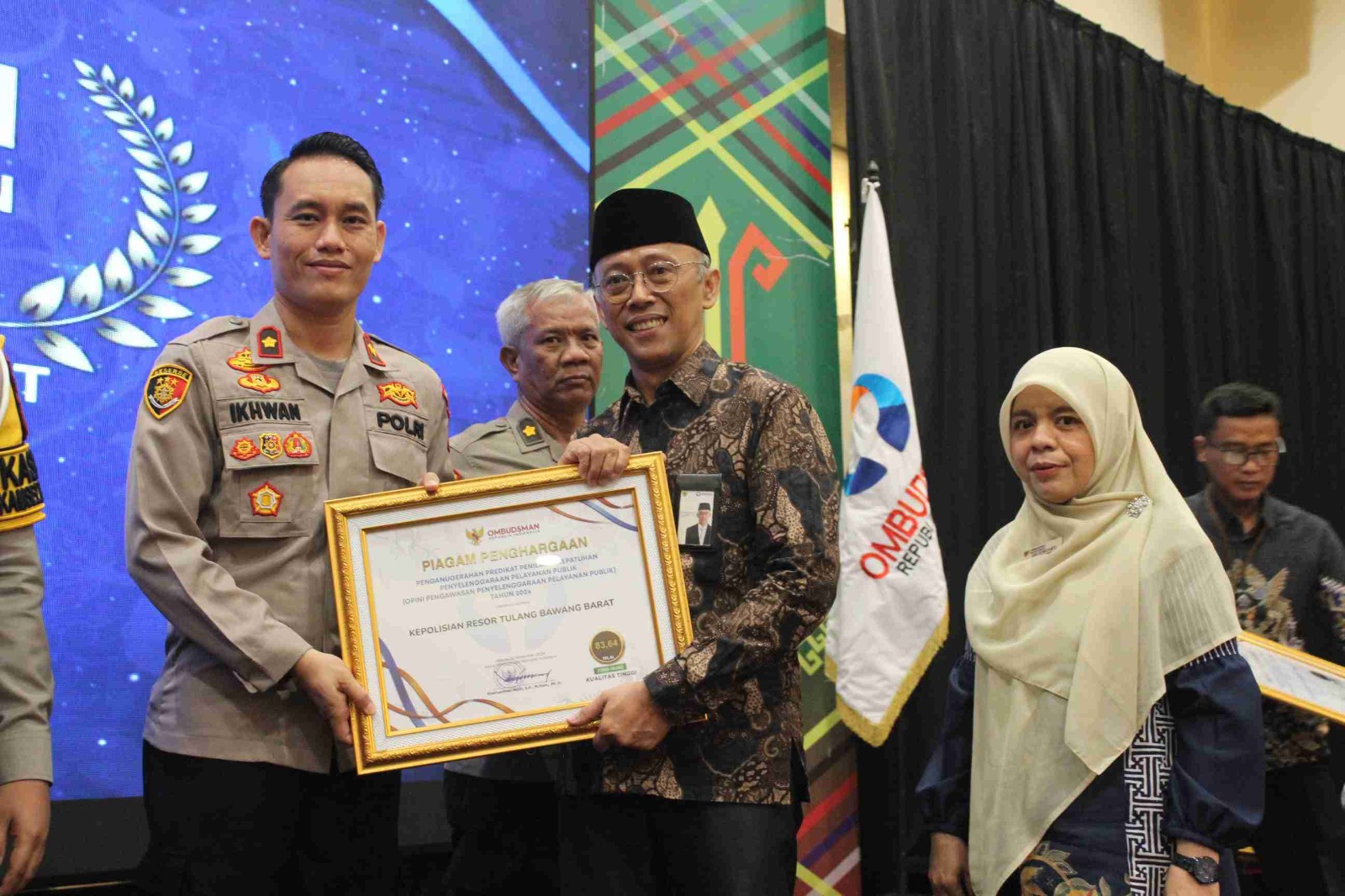 Sementara, piagam penghargaan itu diserahkan langsung oleh Kepala Perwakilan Ombudsman Lampung Nur Rakhman Yusuf dan diterima oleh Wakapolres Tubaba Ikhwan Syukri, S.H., S.I.K., M.H., yang mewakili Kapolres Tubaba