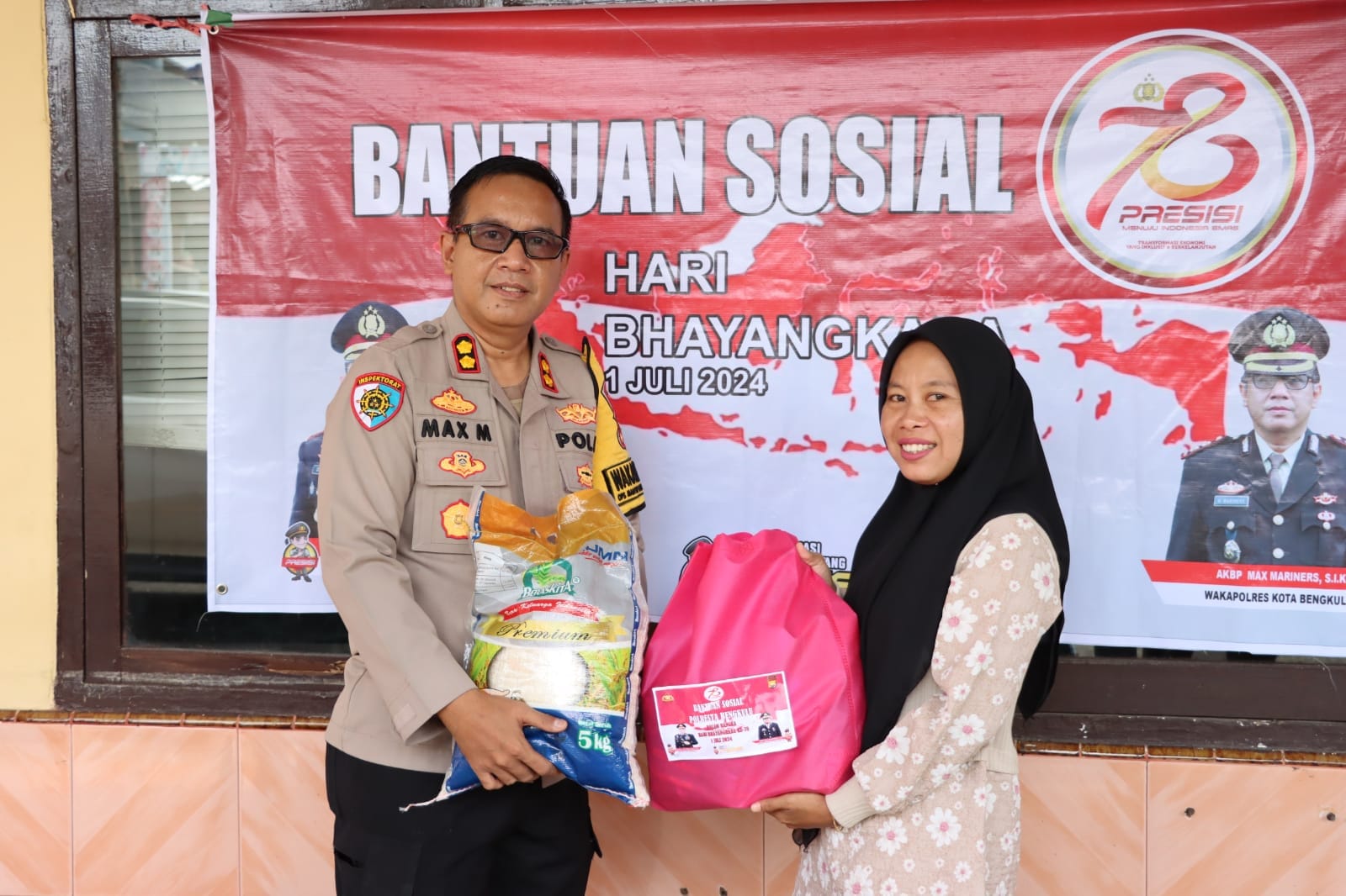 Kapolres Bengkulu Kombes Pol Deddy Nata.,S.I.K melalui Waka Polresta AKBP Max Mariners.,S.I.K mengatakan,kegiatan bansos ini merupakan salah satu rangkaian Hut Bhayangkara ke-78 yang jatuh 1 juli 2024 mendatang.menurutnya kegiatan ini dilaksanakn serentak di seluruh indonesia namun untuk bansos di kota bengkulu disalurkan sebanyak 150 paket sembako dengan adanya bantuan sosial tersebut dapat sedikit meringankan beban masyarakat.