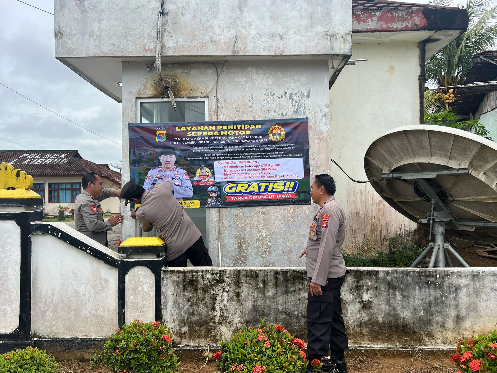 Banner tersebut dipasang di Gerbang Polsek Lambu Kibang sebagai bentuk imbauan dan sosialisasi kepada warga masyarakat bahwa Polsek menyediakan tempat penitipan kendaraan, baik mobil maupun motor, selama musim mudik Lebaran.
