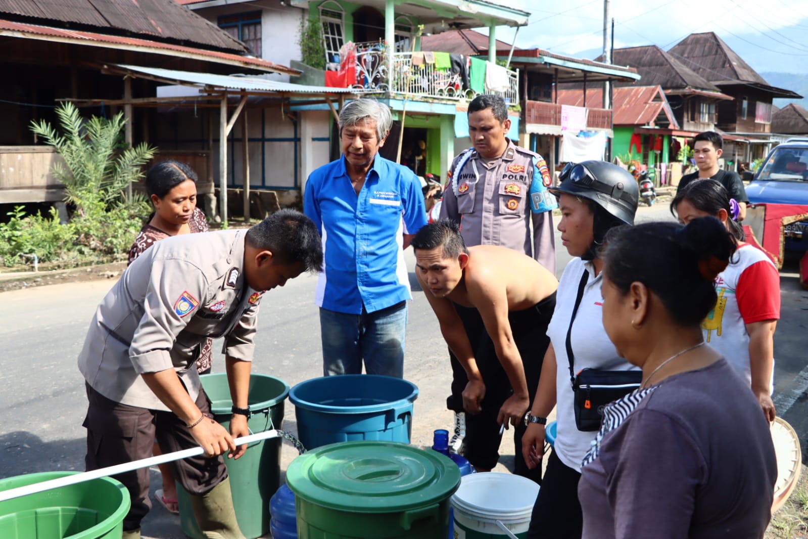 Penyaluran air bersih ini karena dampak banjir membuat air sungai masih keruh dan belum layak digunakan.kata kapolsek