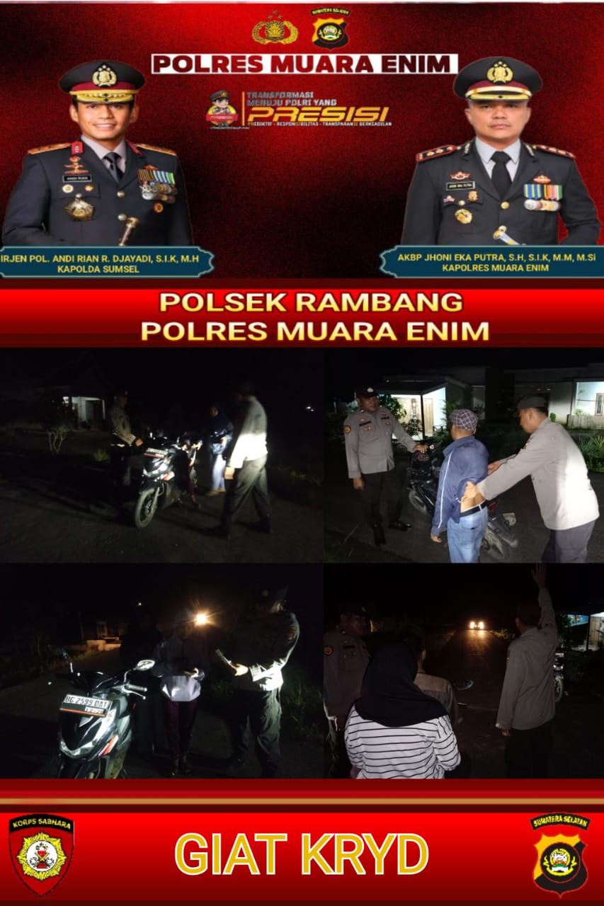 Kapolres Muara Enim AKBP Jhoni Eka Putra, SH, SIK, MM, M.Si, melalui Kapolsek Rambang IPTU Zulkarnain Afianata, ST, M.Si, MH mengatakan dalam pelaksanaan giat tersebut yaitu melakukan razia (21) terhadap pengendara R2 maupun R4 yang melintas dengan sasaran penyakit masyaraka 3C, Lahgun senpi, sajam, premanisme, narkotika, judi, miras, street crime cafe dan warung remang-remang di wilkum Polsek Rambang Polres Muara Enim, serta Cipta Kondisi Kamtibmas dan Kamseltibcar Lantas.