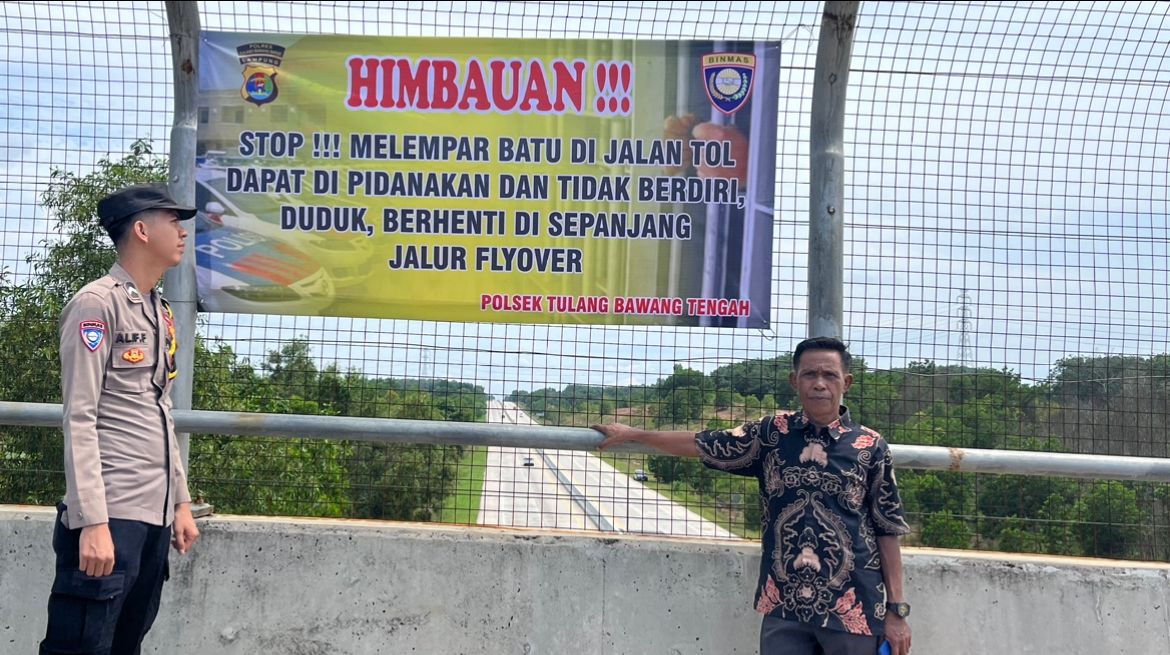 Tulang Bawang Barat,Kompas86.Com Guna mencegah aksi pelemparan batu ke jalan Tol, jajaran Polsek Tulang Bawang Tengah Polres Tubaba Polda Lampung, melaksanakan patroli sekaligus memasang dua spanduk imbauan di jembatan penyeberangan (Fly Over) km 178 Tiyuh Marga Jaya Indah Kec. Pagar Dewa dan Tiyuh wonokerto Kec.Tulang Bawang Tengah Kab.Tulang Bawang Barat. Sabtu (29/03/2025)