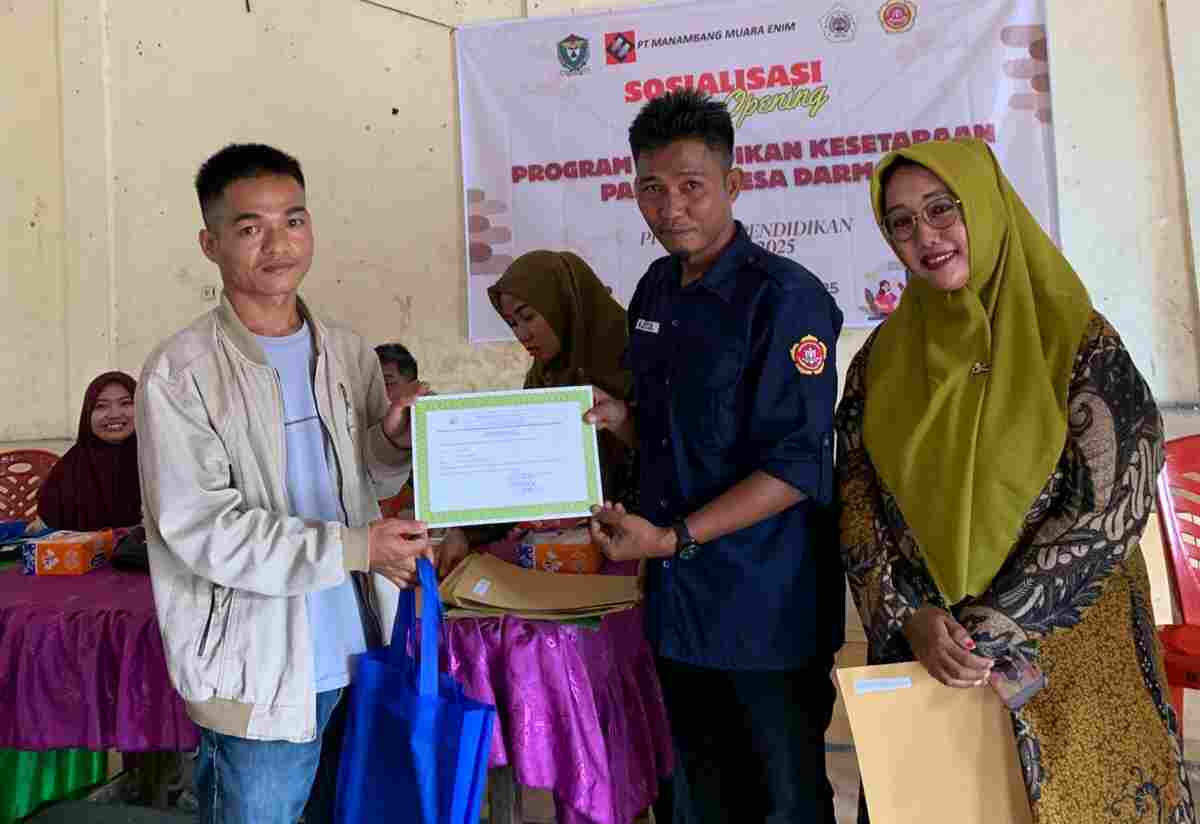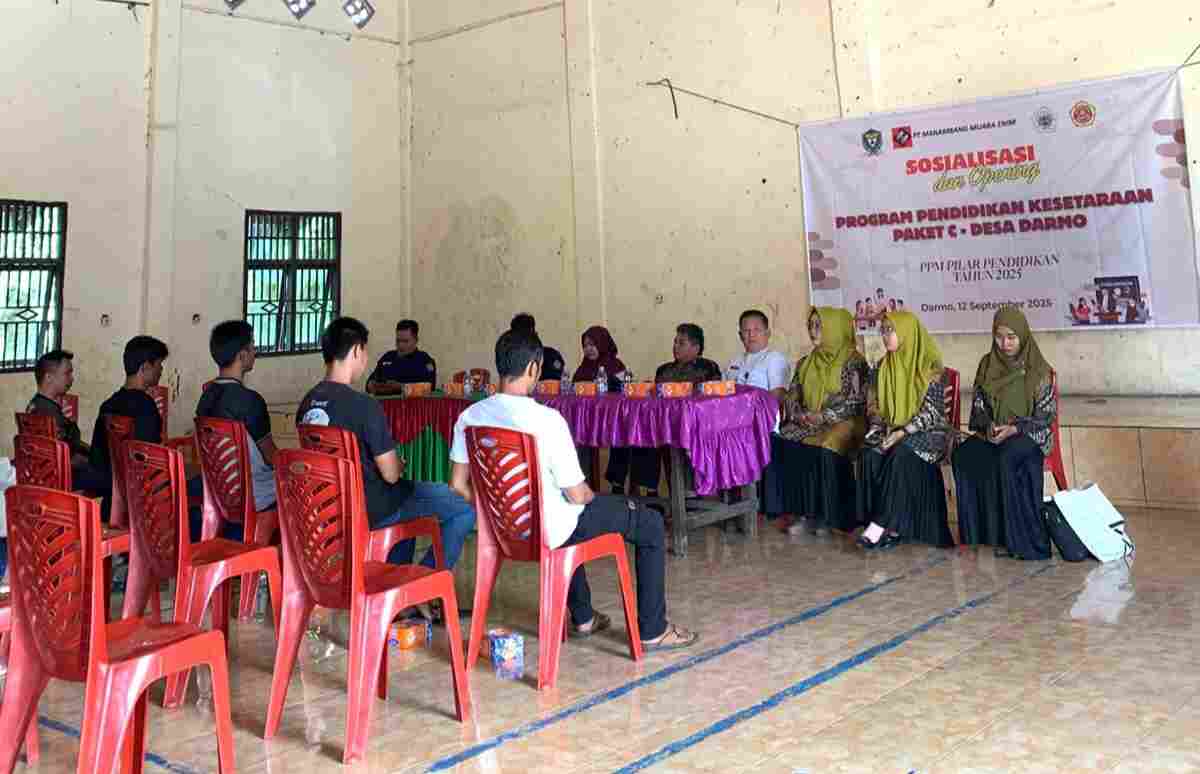 Karang Taruna “Semidang Sakti” dan PT Manambang Muara Enim (MME) melakukan Sosialisasi dan Opening Program Kesetaraan Pendidikan Paket C, khususnya saat Penerimaan Peserta Didik Baru (PPDB) yang difasilitasi oleh Pusat Kegiatan Belajar Masyarakat (PKBM) Yayasan Cendikia Unggul Lawang Kidul, di Gedung Pertemuan Desa Darmo, Jum’at (12/09/2025).