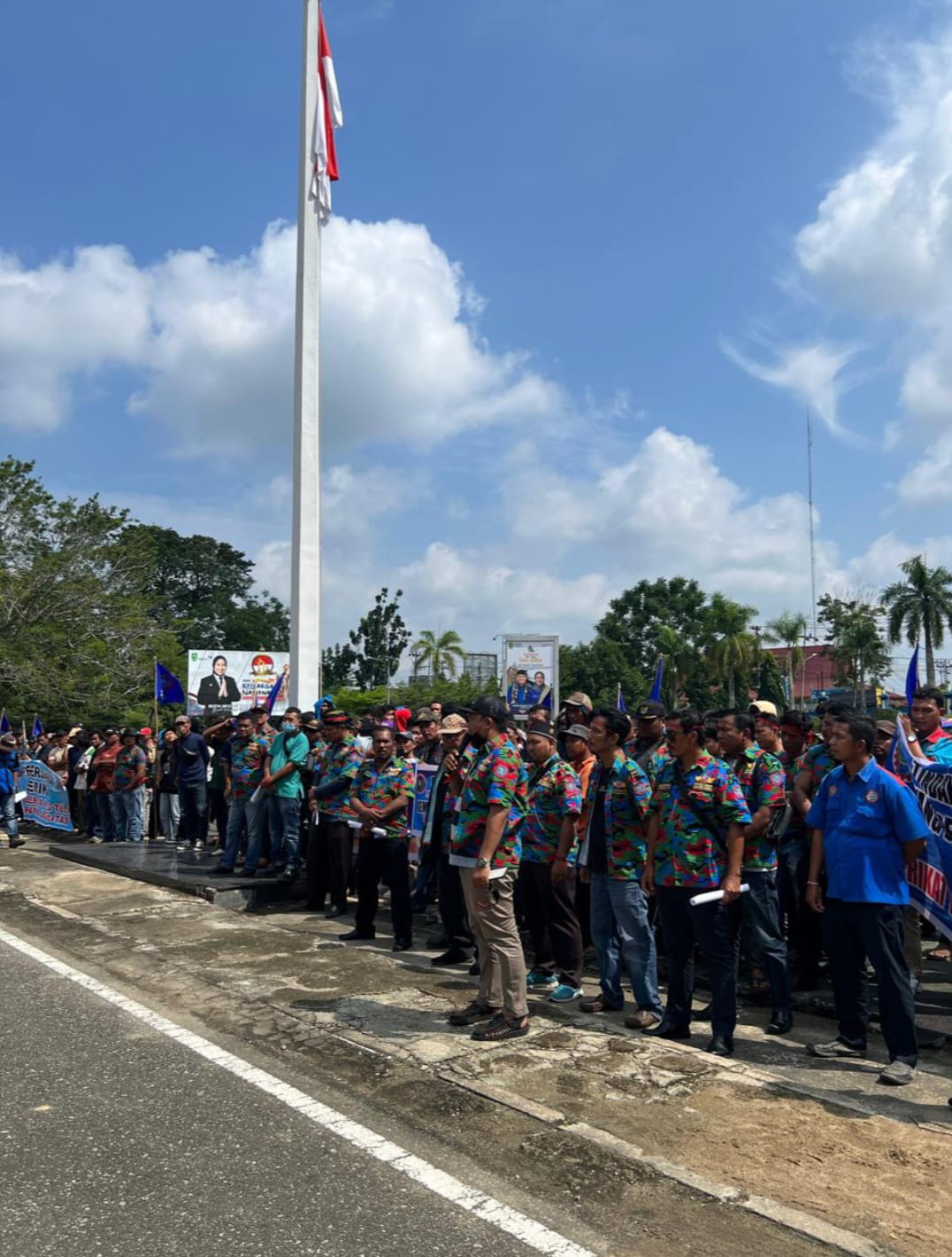 INHU (RIAU) , Kompas86. com – Ratusan Buruh dari Federasi Serikat Pekerja Transportasi Indonesia (F.SPTI) Konfederasi Serikat Pekerja Seluruh Indonesia (K.SPSI) menggelar aksi unjuk rasa didepan Kantor Bupati Indragiri Hulu, jalan raya Pematang Reba, Kecamatan Rengat Barat, Kabupaten Indragiri Hulu, Kamis(18/7/2024).