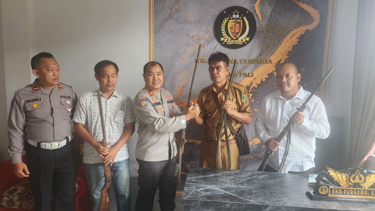 “Setelah mendengar himbauan dari Bapak Kapolres yang disebarkan melalui berita online dan juga oleh Kasat Intelkam kepada para Kepala Desa, warga kami melalui saya langsung berkoordinasi dengan Polres PALI untuk menyerahkan senpi ini,” ujar Sulhandi, Kepala Desa Sungai Baung.