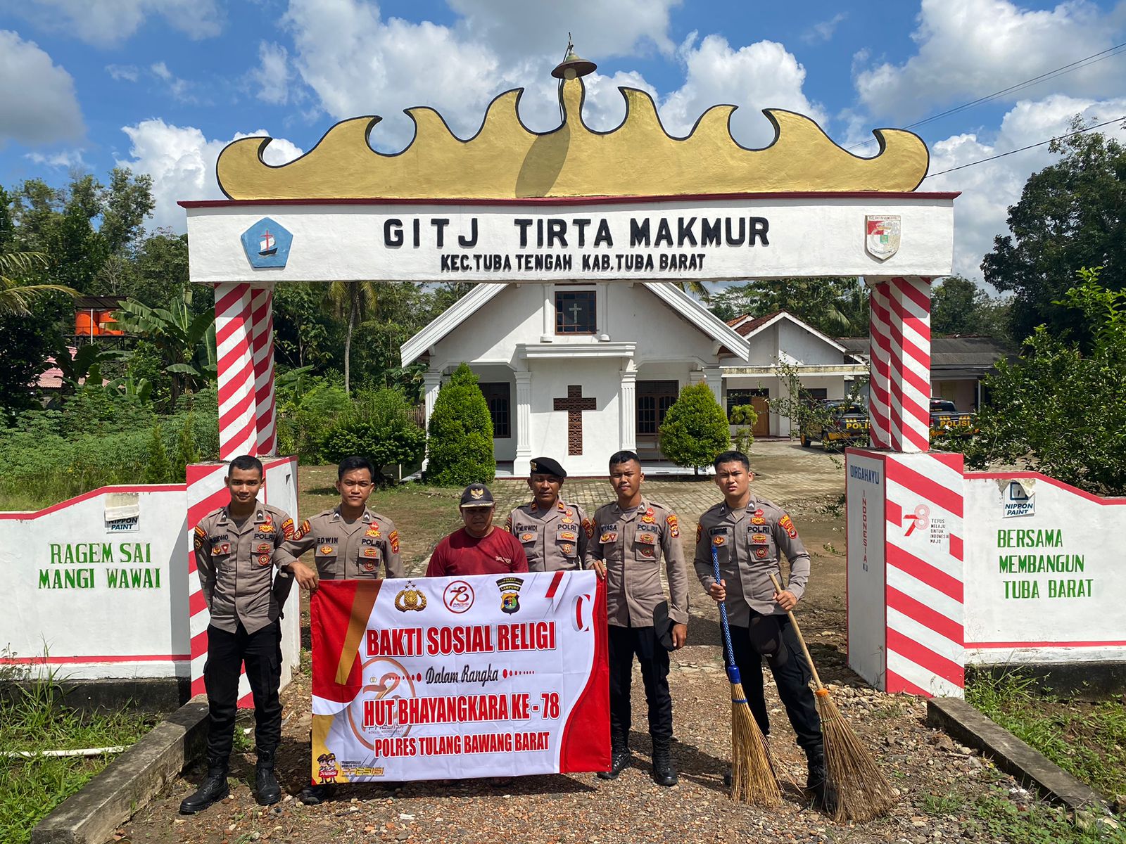 Tulang Bawang Barat,Kompas86.Com Dalam rangka menyambut Hari Bhayangkara Polri ke-78, Sat Samapta Polres Tubaba, Polda Lampung melaksanakan kegiatan bhakti Religi yang digelar di Gereja Injil Tanah Jawa (GITJ) Tiyuh Tirta Makmur