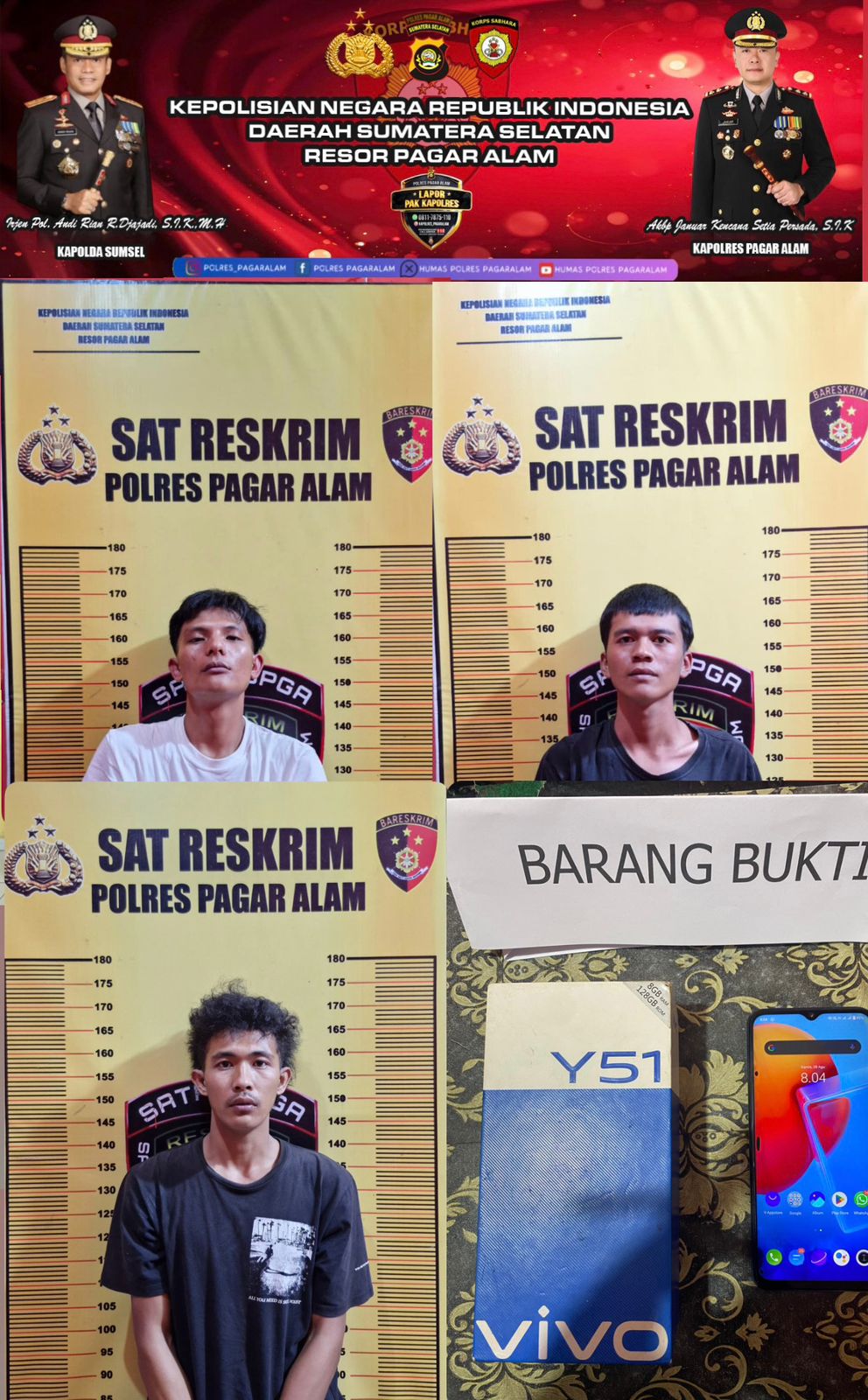 Kasat Reskrim Polres Pagar Alam IPTU Irawan Adi Chandra, SH menjelaskan, pihaknya mengamankan tiga orang pelaku yang masing-masing berinisial Juslay Arikal Lingga (25), Yuni Saputra (23), dan Piola Oka Saputra (28). Dari tangan para pelaku, petugas juga menyita barang bukti berupa satu unit handphone merk VIVO Y51 beserta kotaknya.