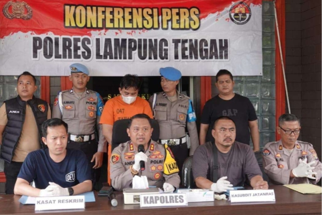 Kepada awak media, Kapolres Lampung Tengah, Polda Lampung AKBP Andik Purnomo Sigit, S.H., S.I.K., M.M dengan didampingi Kasubdit Jatanras Polda Lampung Kompol Ali Muhaidori, Kasat Reskrim AKP Nikolas Bagas Yudhi Kurnia dan Kasi Humas AKP Sayidina Ali, mengatakan bahwa pelaku telah diamankan oleh Tim Gabungan yang terdiri dari Tekab 308 Presisi Polres Lampung Tengah dan Krimum Polda Lampung.