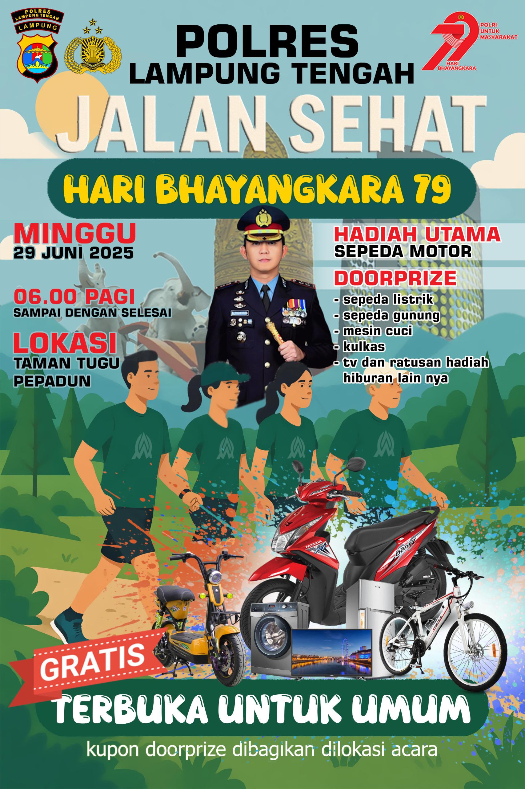 Lampung Tengah–Kompas86.com Dalam rangka memperingati Hari Bhayangkara ke-79 tahun 2025, Polres Lampung Tengah akan menyelenggarakan kegiatan jalan sehat dan senam bersama, bertempat di Taman Tugu Pepadun Gunung Sugih, pada Minggu (29/6/25) mulai pukul 06.00 WIB.