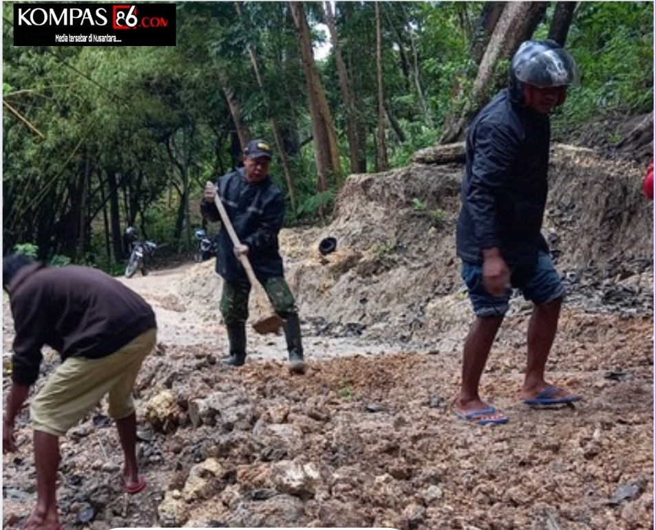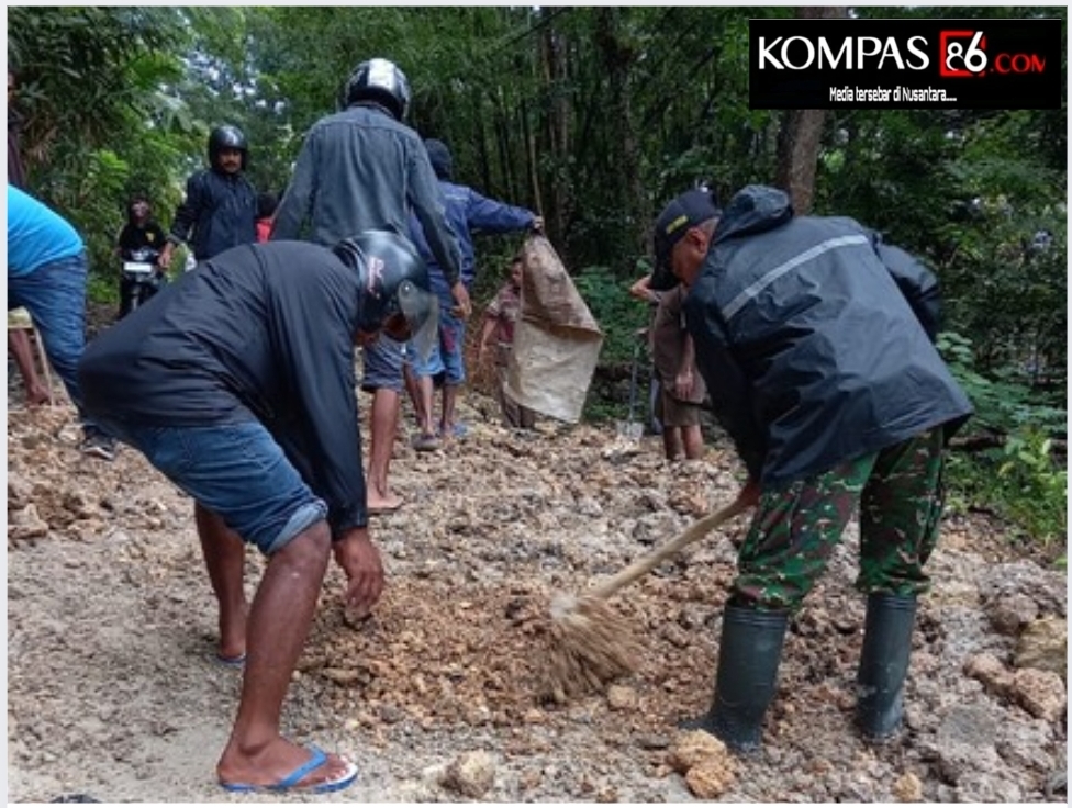 Kompas86.com – Jalan rusak akibat longsor di Desa Kuatae, Kecamatan Kota SoE, Kabupaten Timor Tengah Selatan, Provinsi Nusa Tenggara Timur, mulai diperbaiki melalui kegiatan gotong royong oleh warga bersama Babinsa dan pemerintah desa, Jumat (13/06/25).