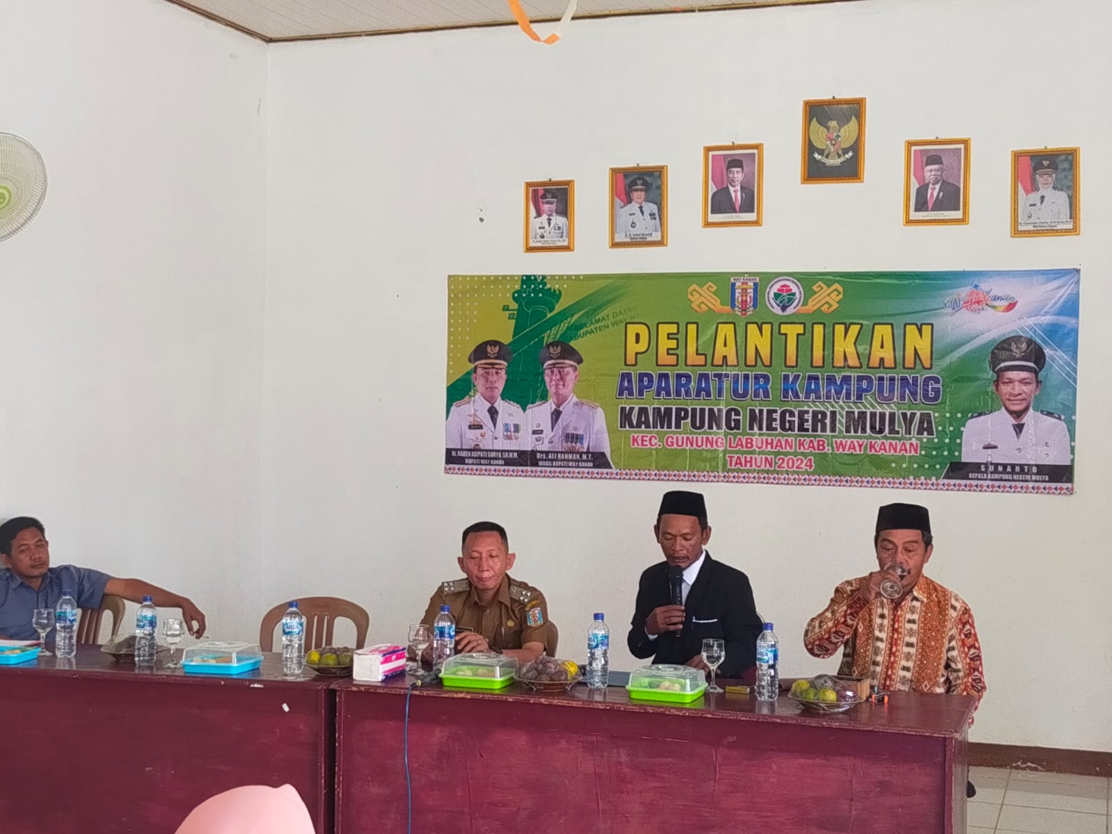 Dalam sambutannya,,Kepala Kampung Negeri Mulya Kecamatan Gunung Labuhan Kabupaten Waykanan mengharapkan,Dengan adanya pelantikan aperatur kampung yang baru ini agar selalu mengikuti aturan dan taat menjalankan tugas tugasnya sebagai pelayan masyarakat yang berada di kampung ini pada umumnya.