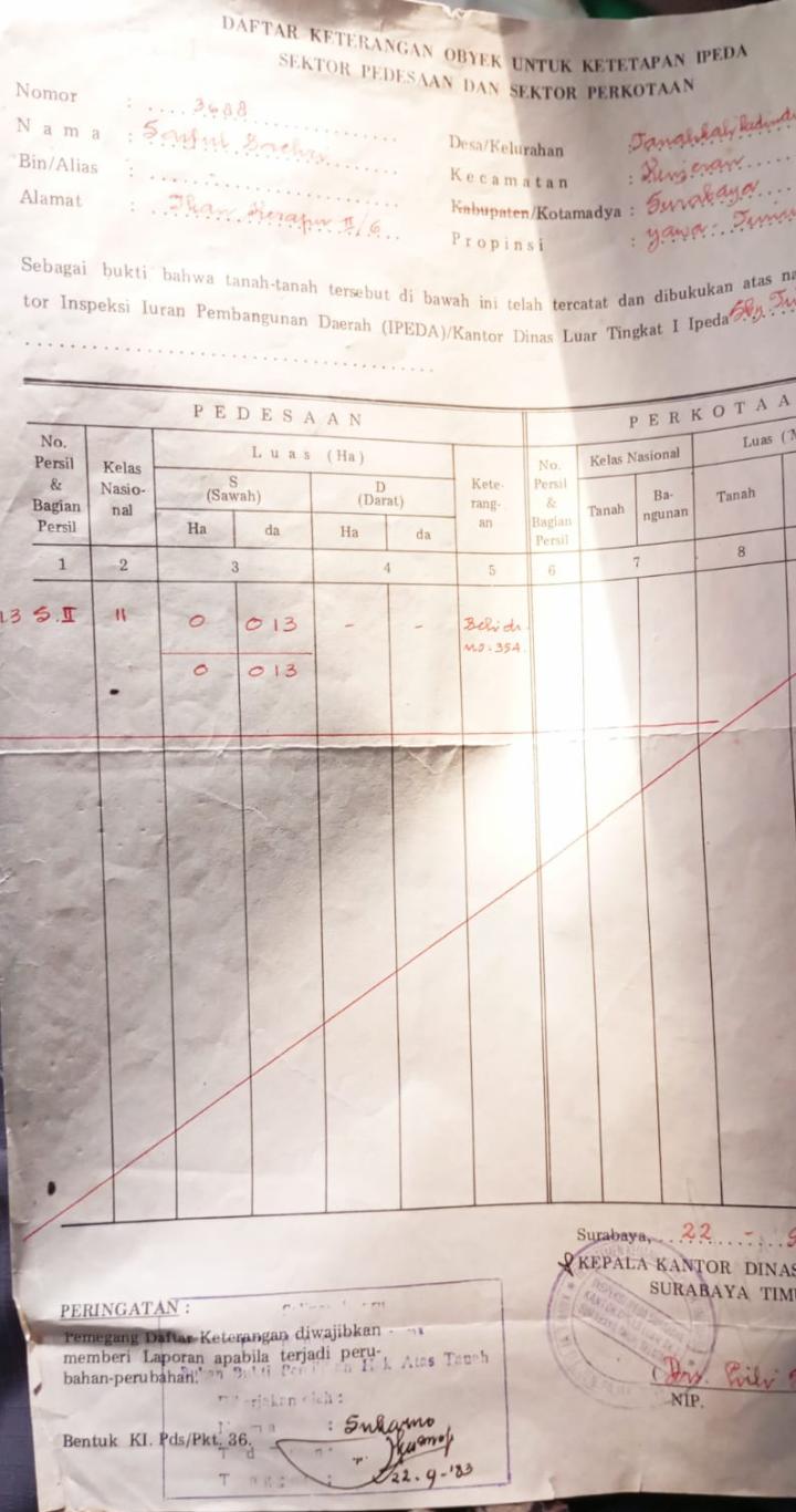 Tetapi jawaban oleh Lurah Tanah Kalikedinding dan Camat Kenjeran sangat mengecewakan. “Lurah mengakui bahwa Nomer Petok D nomer 013 memang benar, tetapi lokasinya berbeda dan berada di nomer 016. Tanpa ada alasan yang jelas dari Lurah Tanah Kalikedinding, malahan menyuruh mengajukan gugatan ke PTUN, ujar Agus.