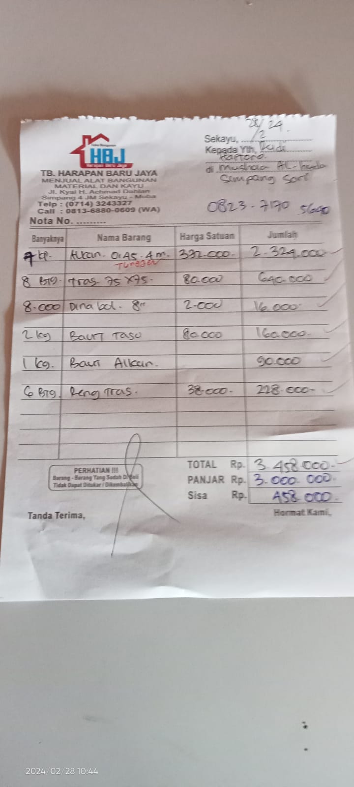 Musi Banyuasin (Sumsel) Kompas86.com__, Pengurus Mushola Al-Huda desa simpang sari kecamatan Lawang Wetan Kab Muba ( Rd) berharap adanya uluran tangan dari para donatur untuk membantu melunasi belanja barang material di toko TB Harapan Baru jaya, jl kyai H. Akhmad Dahlan Simpang Empat JM Sekayu Muba. (28/02/2024)