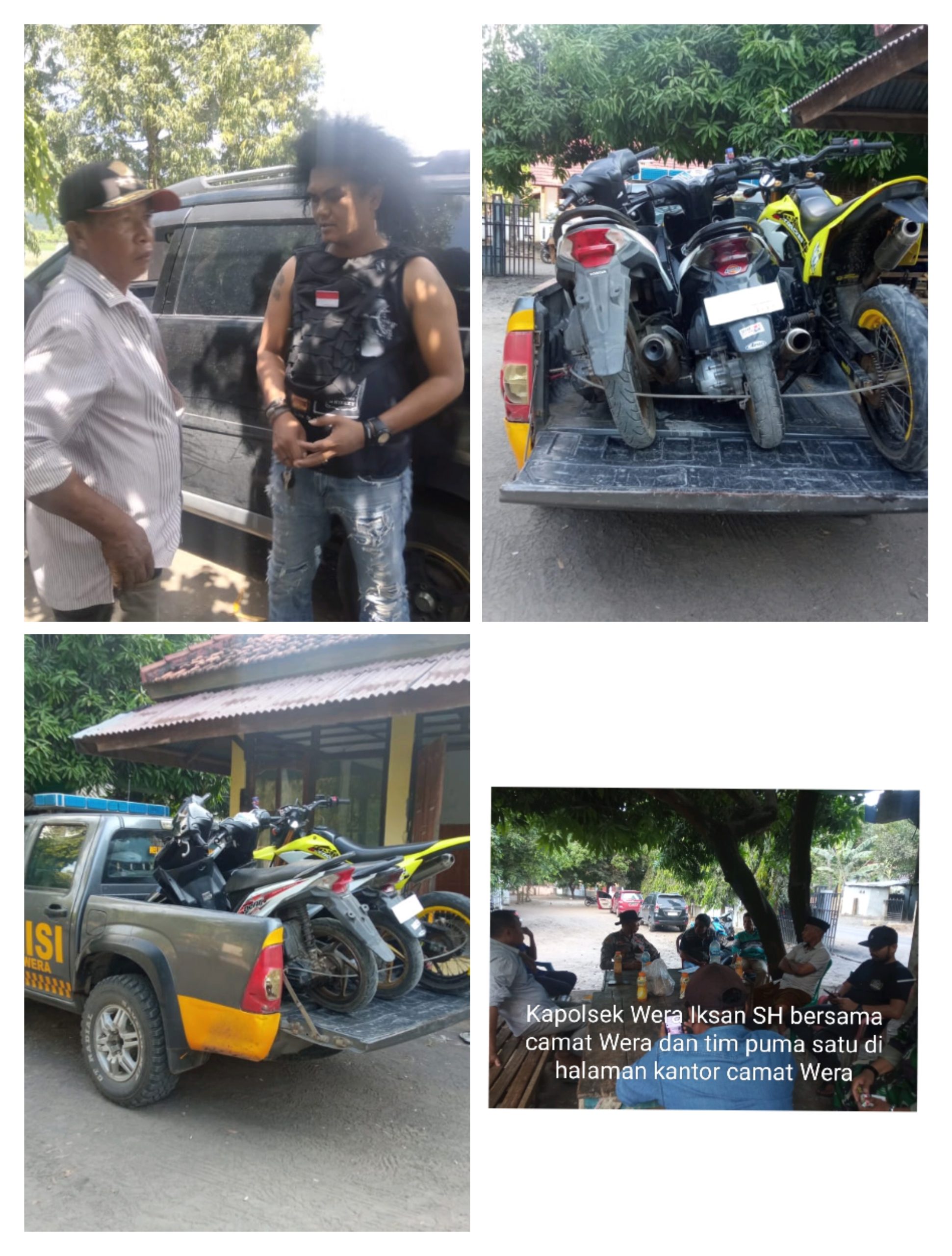 pada hari selasa tanggal 11 juni 2024 sekitar pukul 11.20 wita telah terjadi tawuran antara beberapa kelompok warga Masyarakat desa wora dan warga Masyarakat Desa tawali, tawuran terjadi diakibatkan oleh imbas tawuran yang terjadi pada hari sabtu tanggal 8 juni /2024 ,tawuran yang sangat meresahkan warga masyarakat tersebut di bubarkan oleh polsek wera bersama tim puma 1 polres bima kota, Tim puma Satu dan Polsek Wera mengamankan beberapa alat yang di gunakan untuk tawauran berupa sajam senjata tajam ,parang, busur panah dua unit dan 3 unit sepeda motor jenis trail Tracker Tampa Plat nomor sejenis LX Warna Kuning Honda Bit EA, 2565 SE, Honda Bit warna putih Tampa Plat nomor