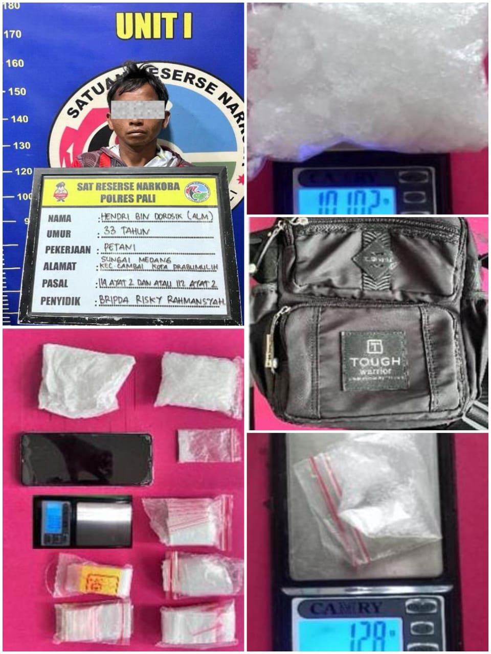 Seorang pria berinisial H (33), warga Kelurahan Sungai Medang,Kecamatan Cambai,Kota Prabumulih,diamankan bersama barang bukti sabu seberat total 102,3 gram dan sejumlah peralatan pendukung.