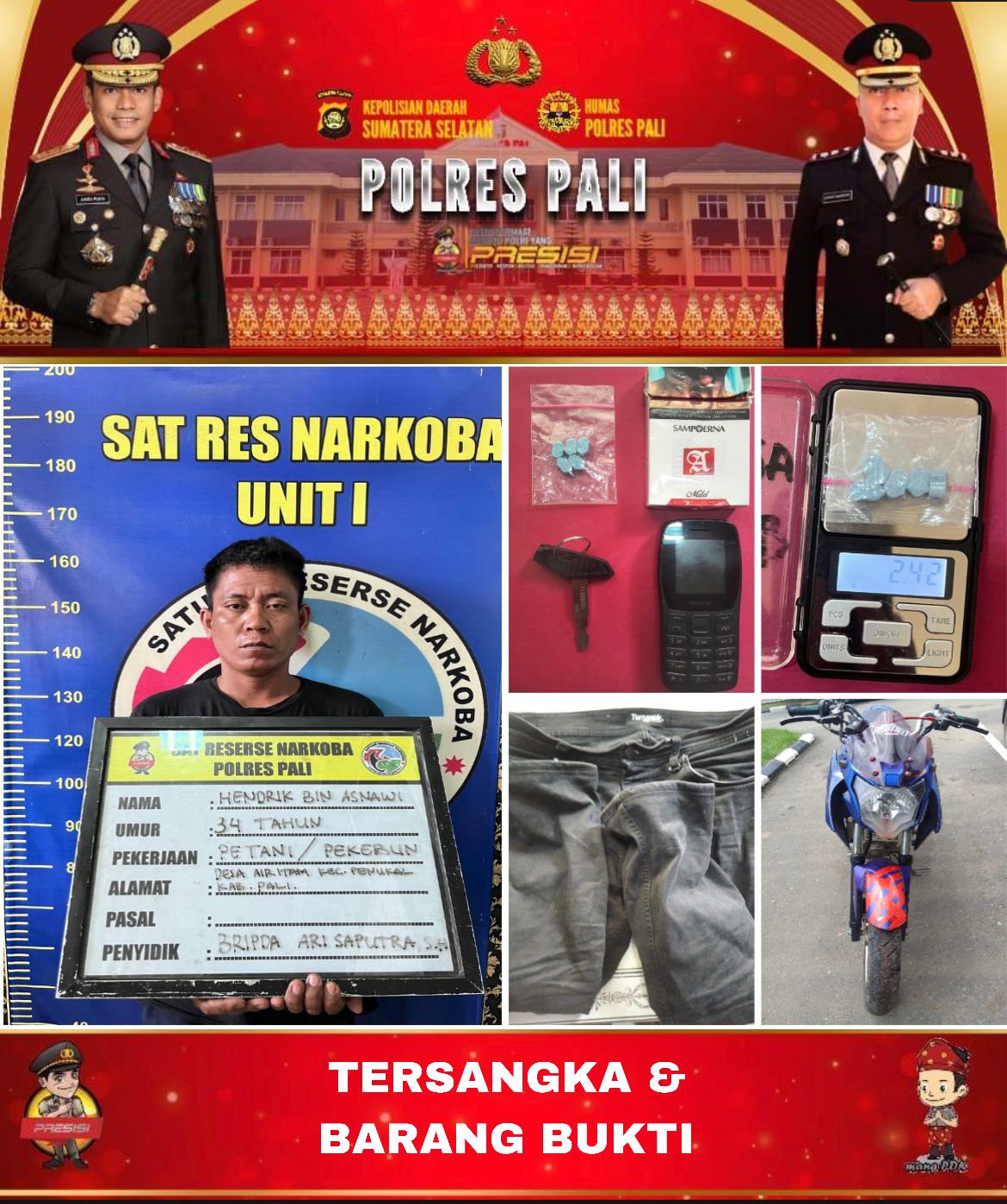 Terduga pelaku berinisial HD (34), warga Desa Air Itam, Kecamatan Penukal, ditangkap berdasarkan laporan polisi LP/A/04/II/2025/SPKT.Resnarkoba/Res.Pali/Polda Sumatera Selatan yang dikeluarkan pada 6 Februari 2025.